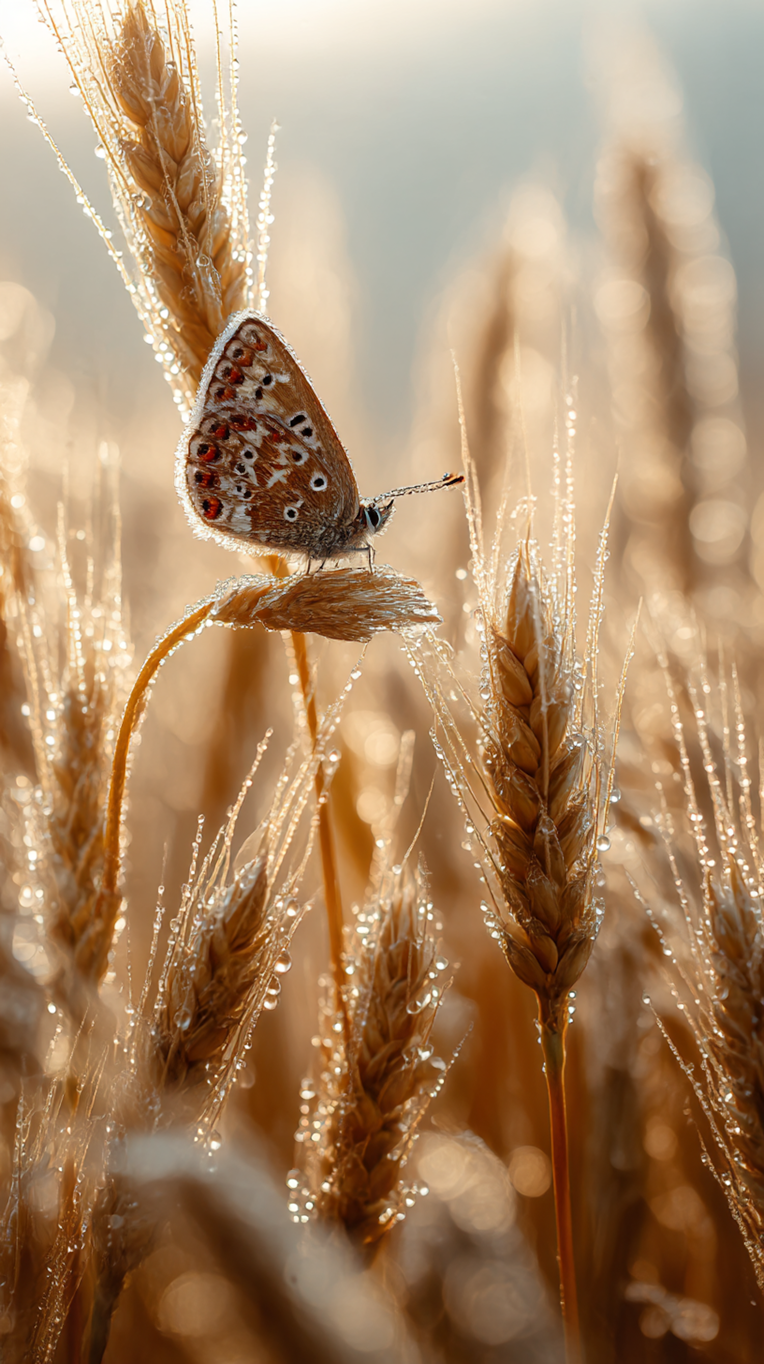 A butterfly rests on a dew-covered wheat stalk in a golden field, with soft light highlighting the intricate details of the scene.