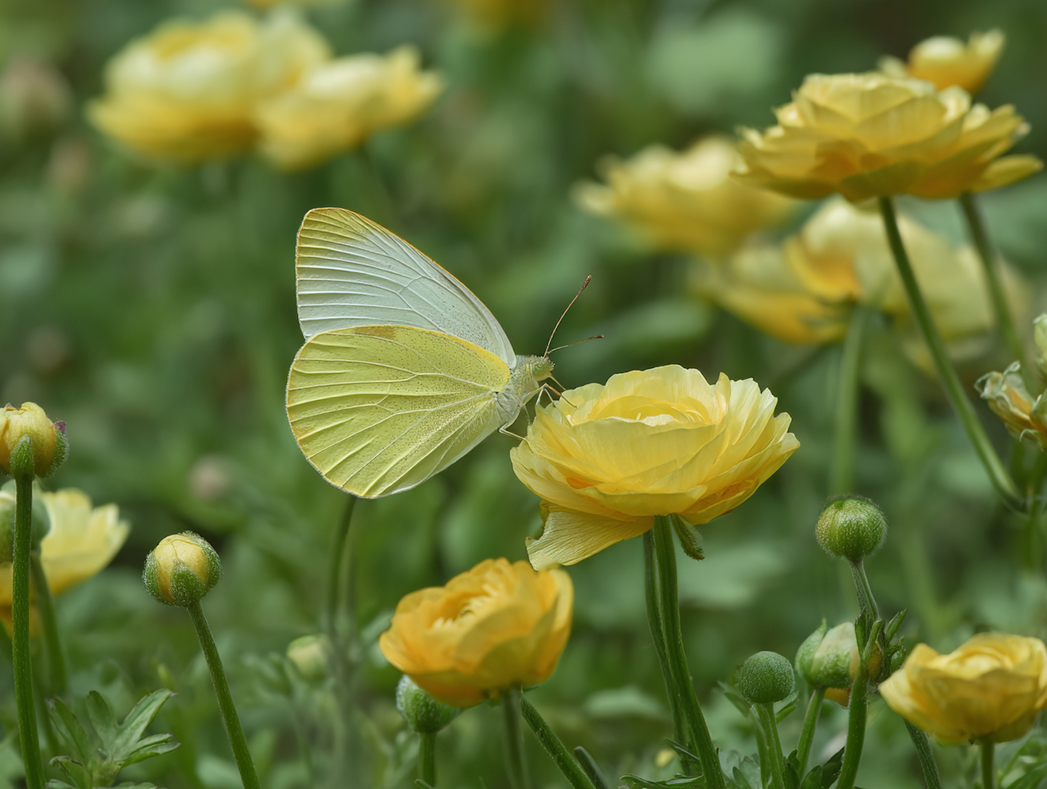A pale yellow butterfly resting on a yellow flower amidst a lush garden, showcasing nature's vibrant and peaceful beauty.