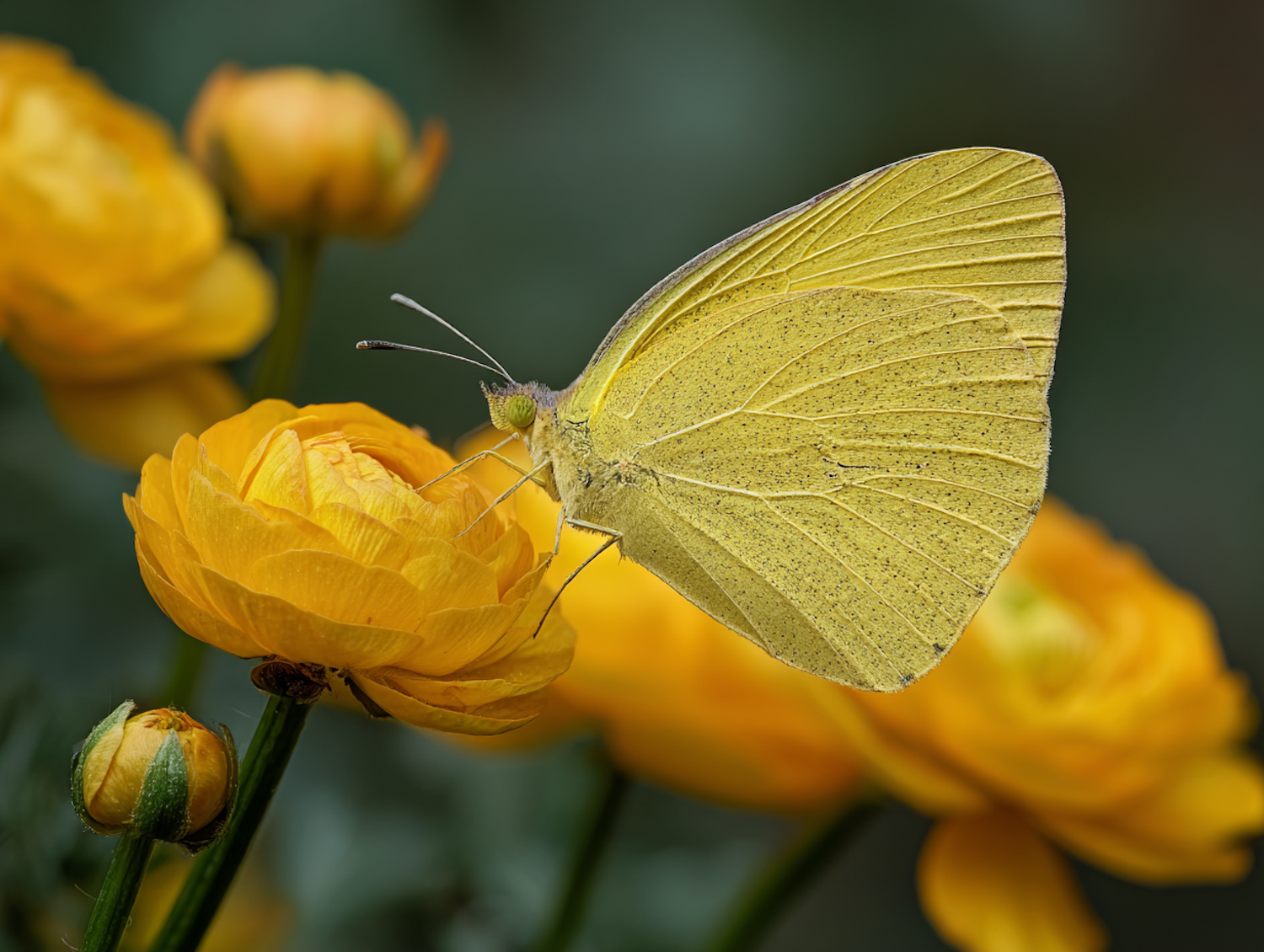 Close-up of a yellow butterfly perched on a vibrant yellow flower, surrounded by soft green and yellow natural tones in the background.