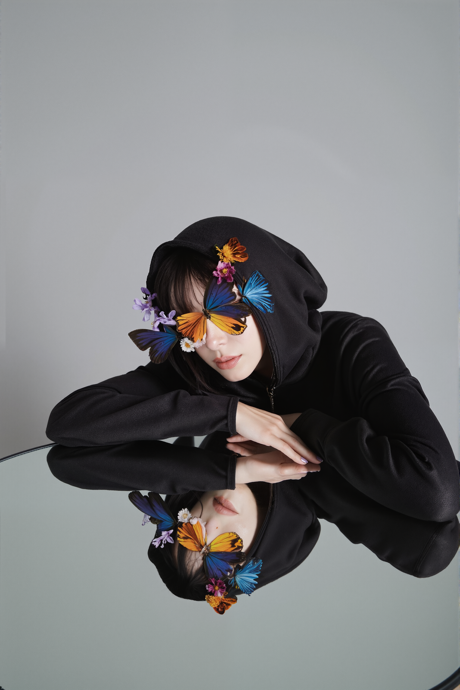 A woman in a black hoodie with colorful butterflies and flowers on her face, resting on a reflective surface. Artistic and surreal vibe.