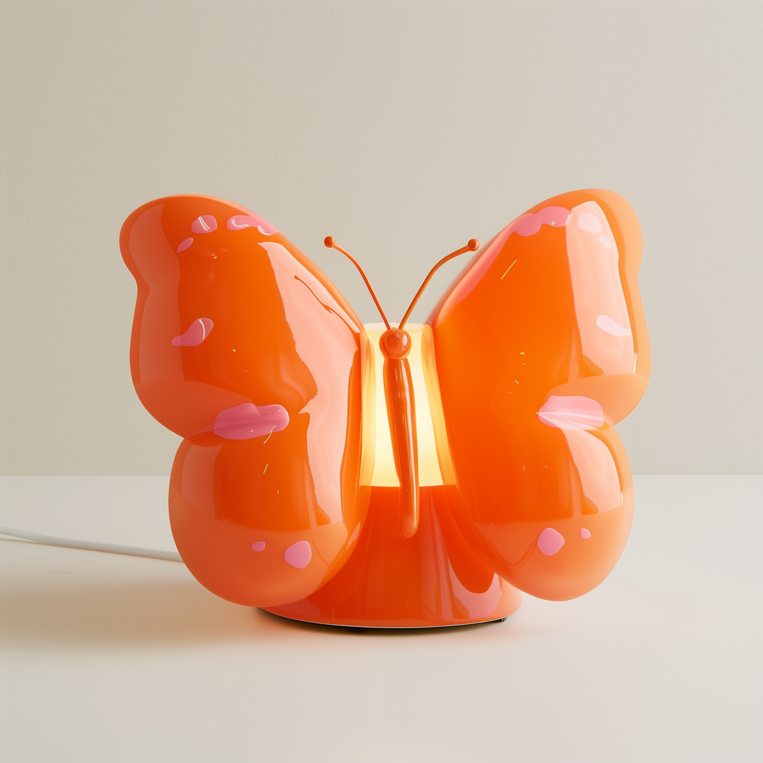 Bright orange butterfly-shaped lamp with pink accents, glossy finish, and warm glow, perfect for whimsical and cozy decor.