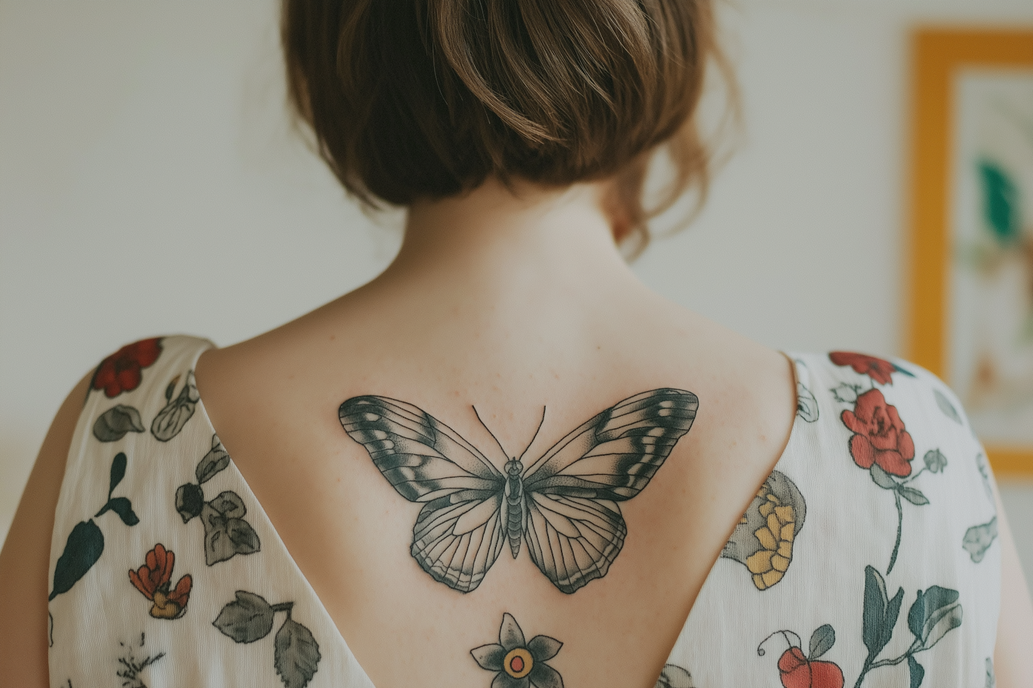 A detailed butterfly tattoo on a woman's back, paired with a floral-patterned dress and a softly blurred background for a serene vibe.