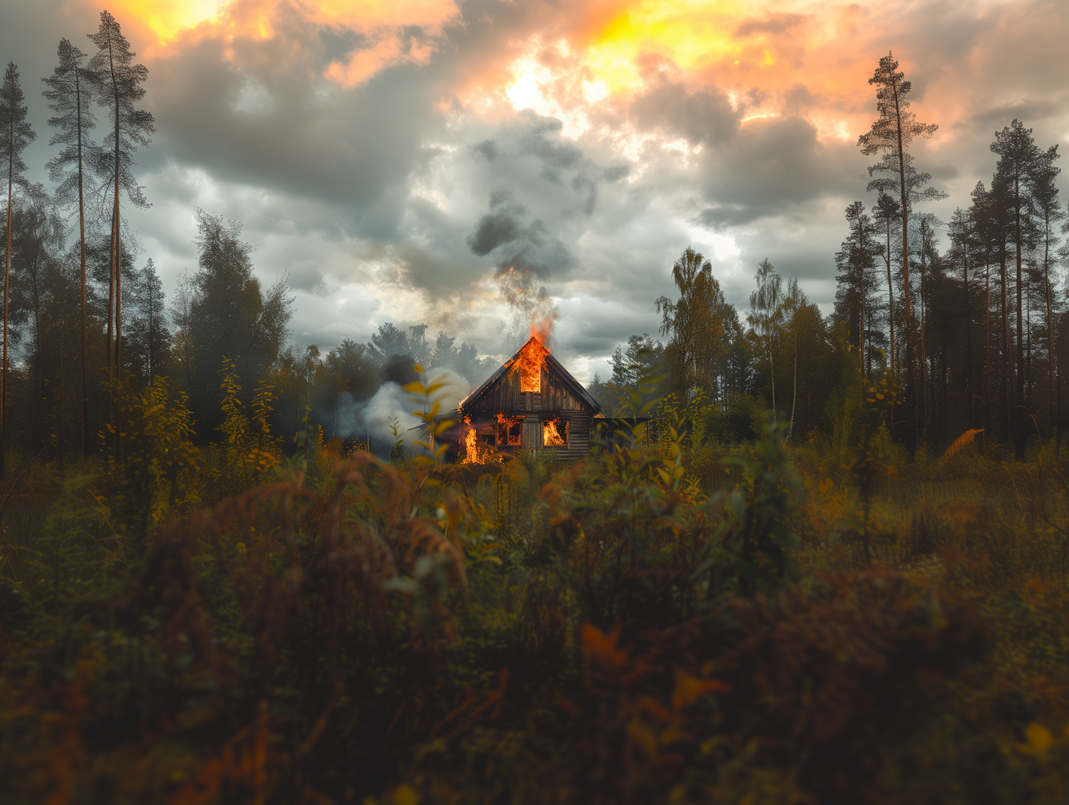 A dramatic scene of a wooden cabin on fire amidst a forest, with a fiery sky and dense vegetation in the foreground.