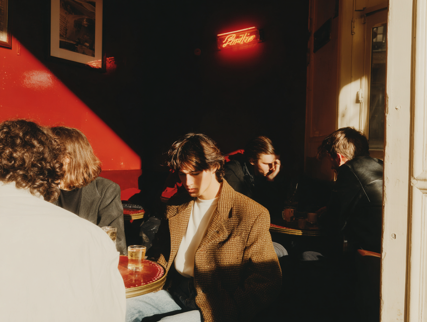 A cozy café scene with warm lighting, red walls, and a neon sign, featuring individuals engaged in quiet conversation.