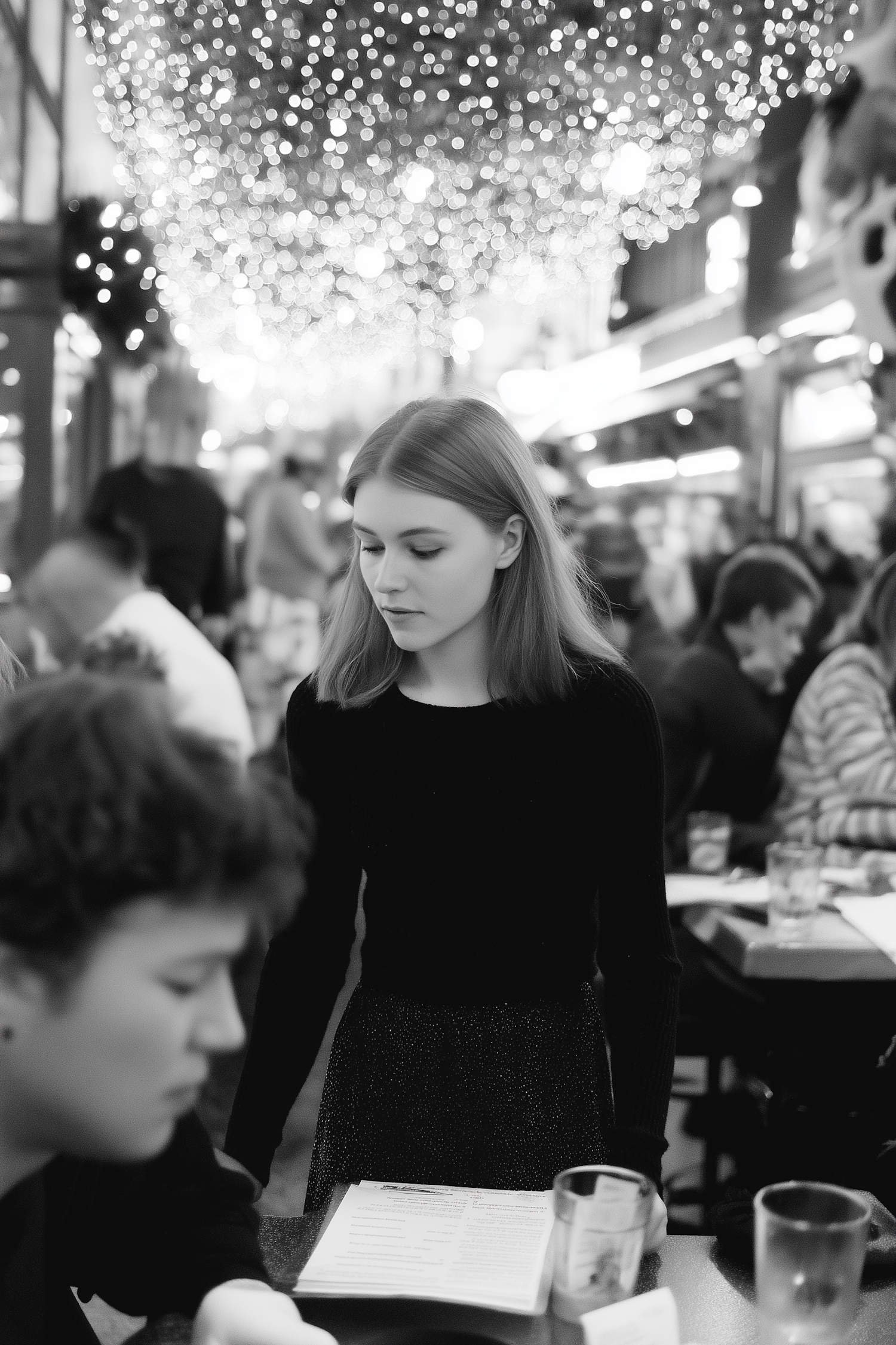 A cozy black-and-white café scene, with a young woman in focus and festive lights creating a lively and warm atmosphere.