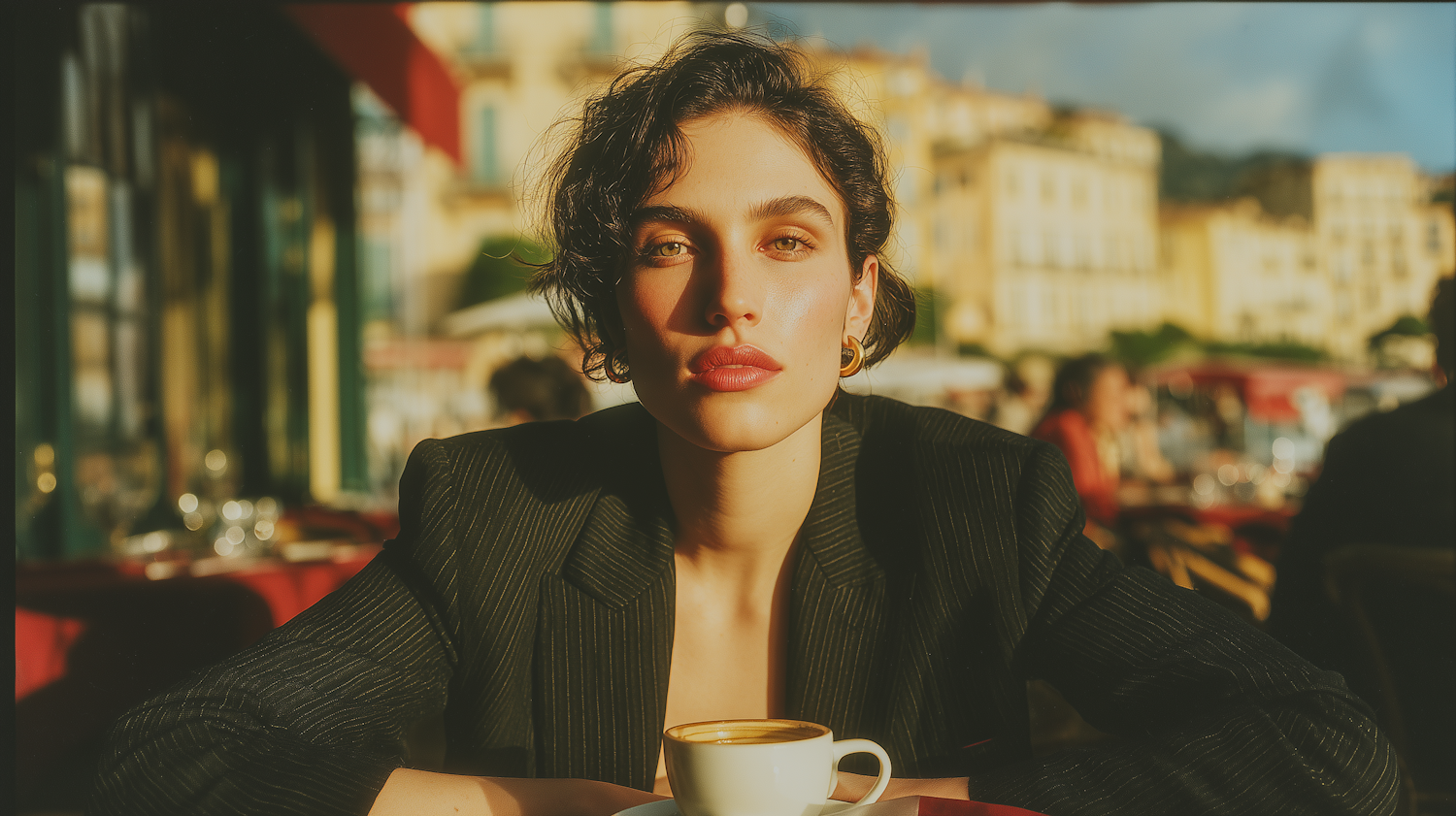 A person in a black blazer sits at a café table with a coffee, set against a sunny urban backdrop with blurred buildings and patrons.