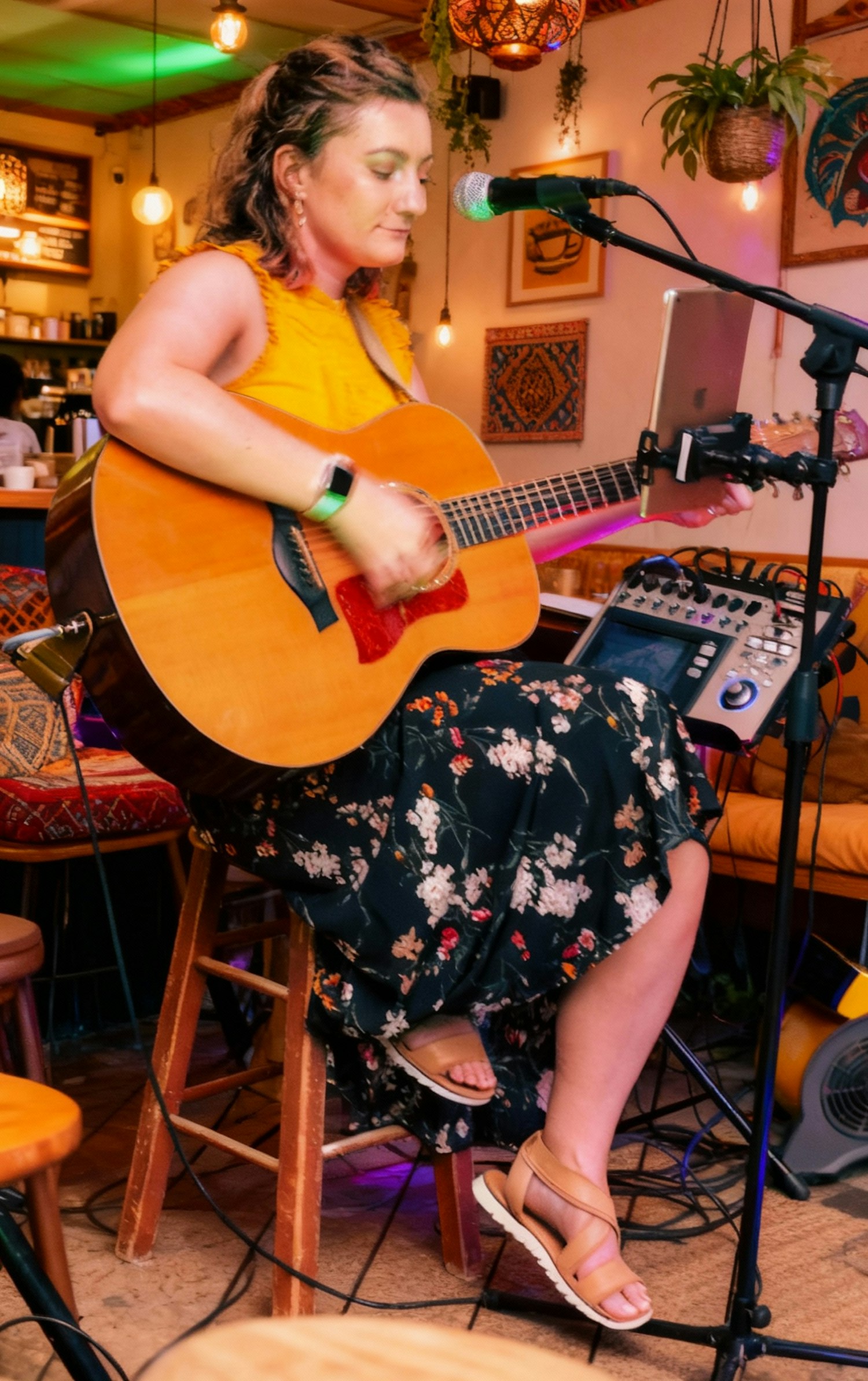 A woman performs live music in a cozy cafe, playing an acoustic guitar. The warm lighting and decor create an inviting atmosphere.