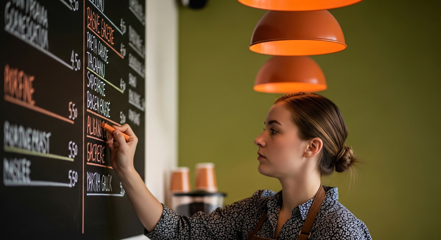 A cafe worker updates a chalkboard menu with colorful chalk, set against a cozy interior with green walls and orange pendant lights.