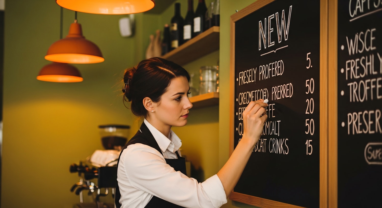 A barista in a cozy cafe updates the chalkboard menu under warm orange lighting, surrounded by shelves of bottles and glasses.
