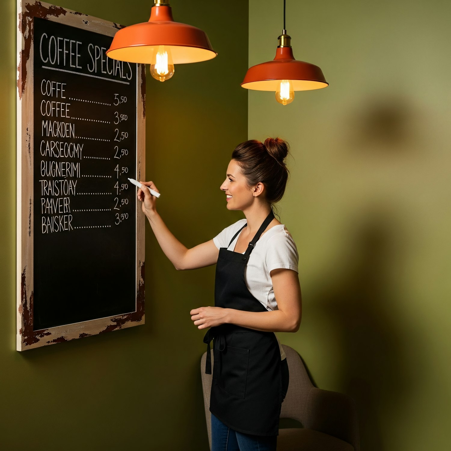 Barista updating a chalkboard menu in a cozy cafe with warm lighting and a green wall, showcasing coffee specials.