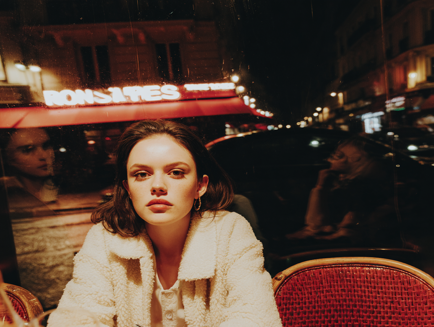 A young woman sits at a café table at night, with warm lighting and urban reflections creating a cozy and atmospheric scene.