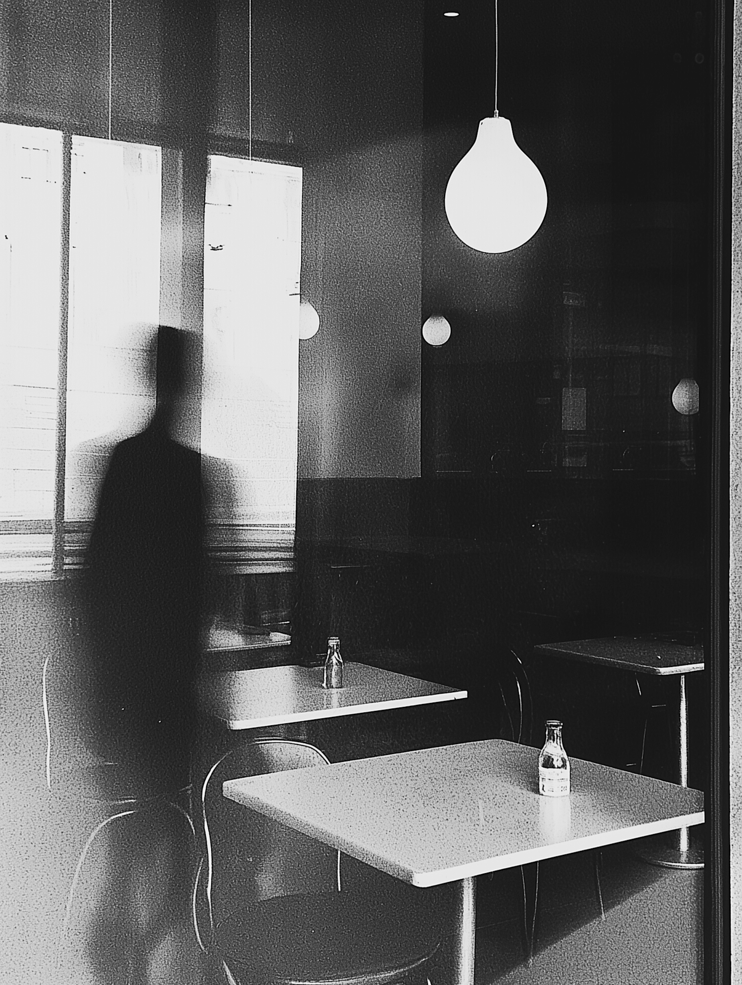 Black and white cafe interior with a glowing bulb, empty tables, and a blurred silhouette, creating a serene and minimalist atmosphere.