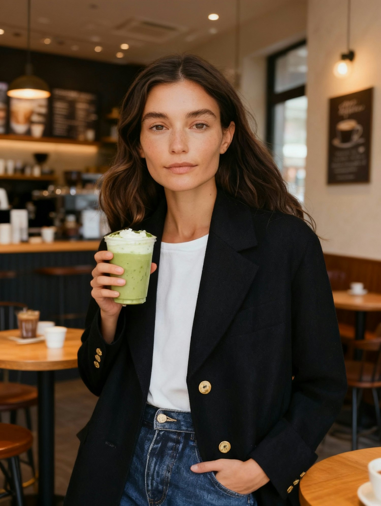 A woman in a black blazer enjoys a green smoothie in a cozy café with warm lighting and wooden furniture.