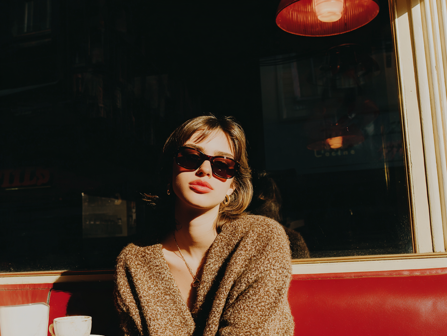 A woman in sunglasses sits in a sunlit cafe, wearing a brown sweater, with a coffee cup on the table and a warm, inviting ambiance.