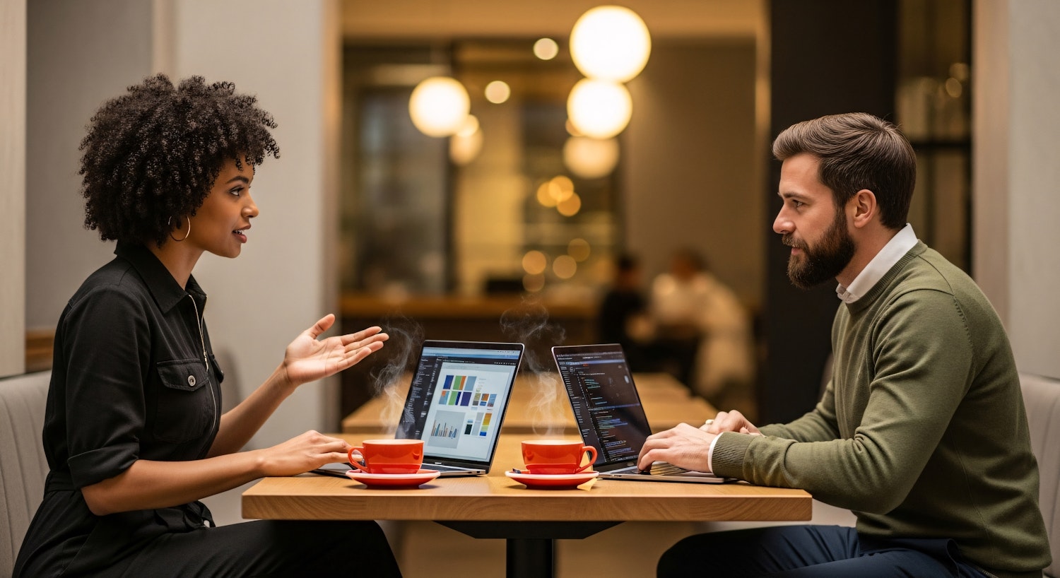 Two professionals discuss work over laptops and coffee in a modern cafe, showcasing collaboration and productivity in a casual setting.