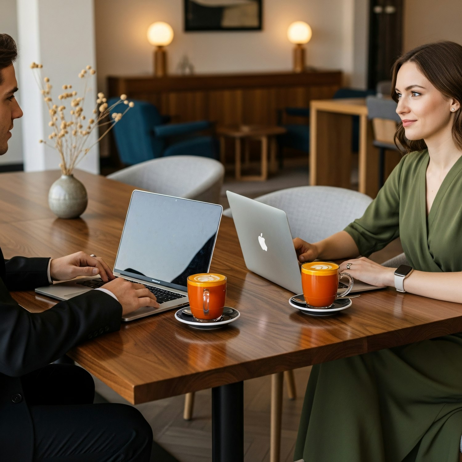 Two professionals working on laptops in a modern cafe, enjoying lattes in orange cups. A cozy and productive atmosphere.