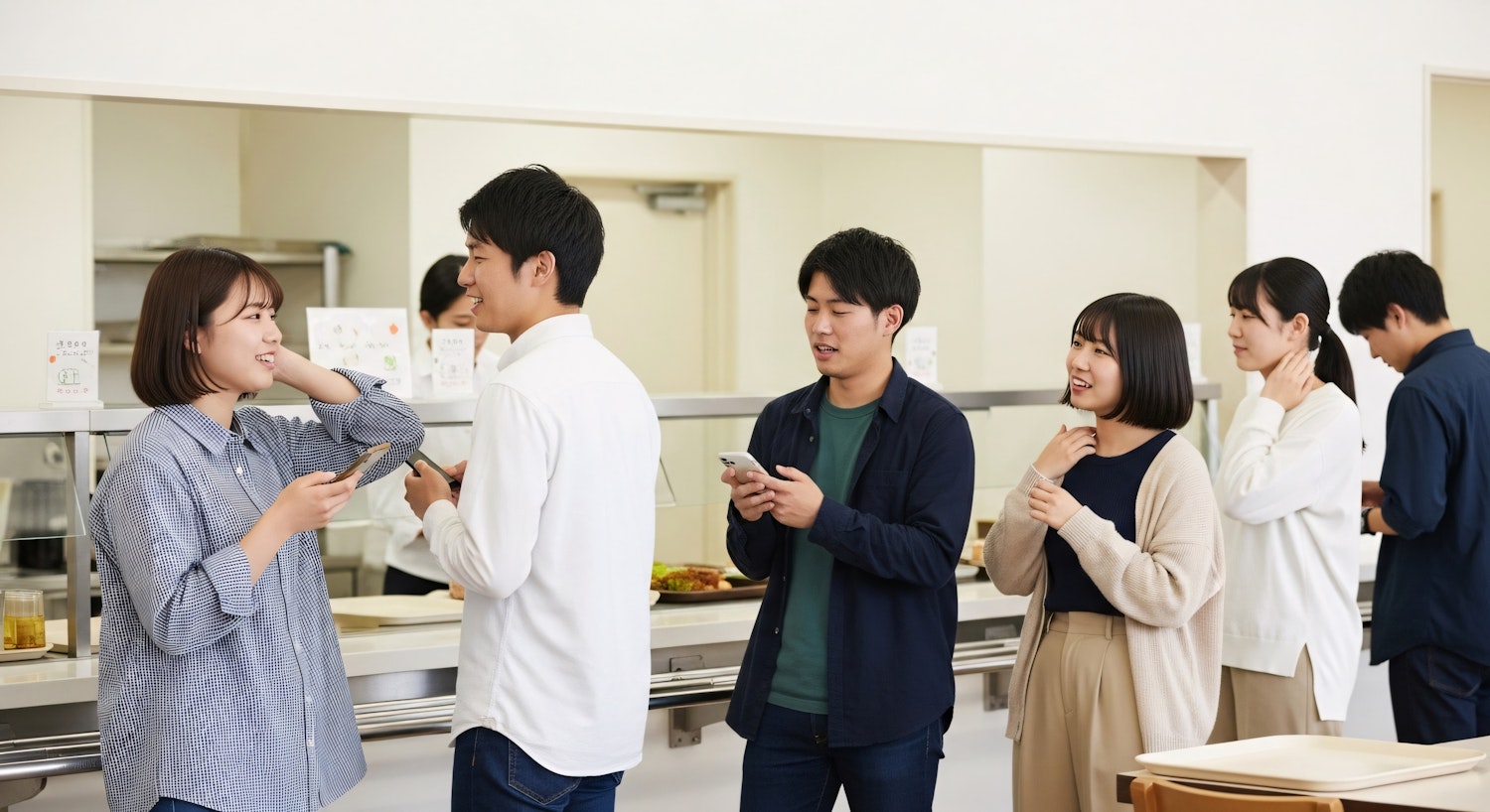 A group of young adults chatting and using phones while waiting in a cafeteria line, creating a casual and social atmosphere.