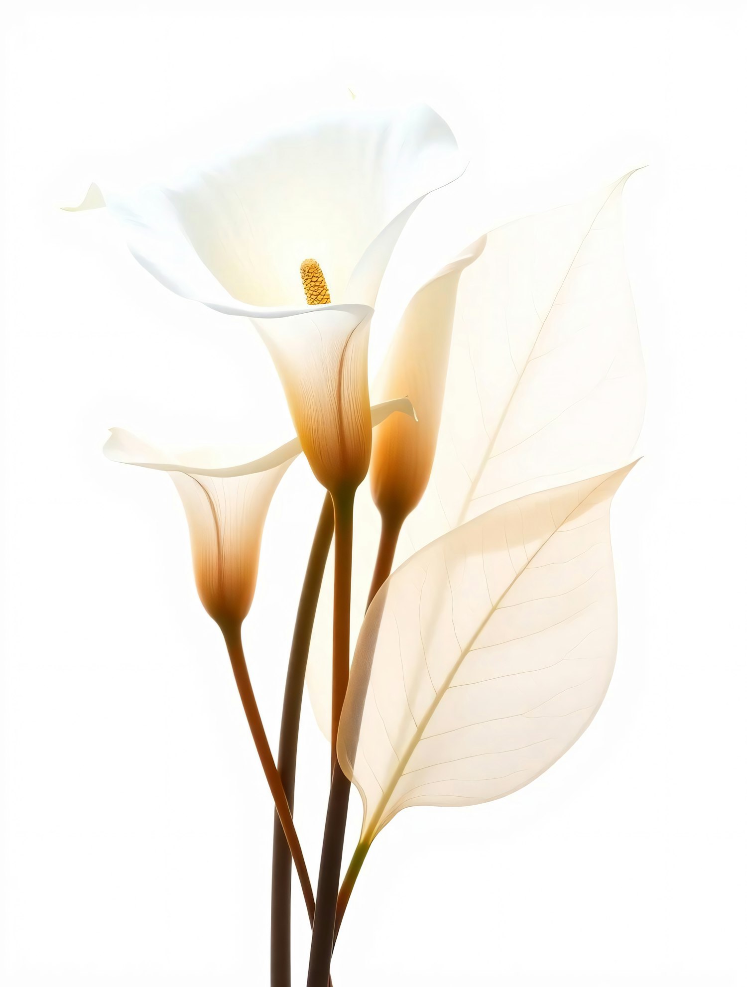 Elegant calla lilies with translucent leaves and soft white petals, beautifully lit against a clean white background.