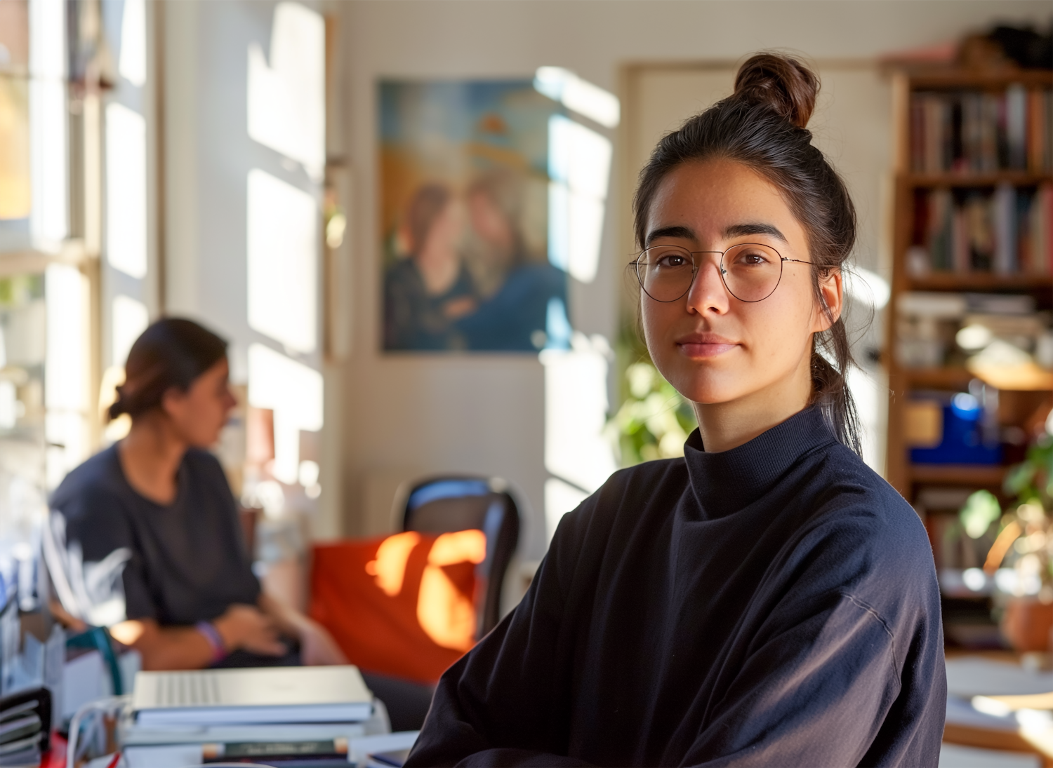 Confident young woman in glasses and turtleneck in a sunlit room, with a blurred background of a colleague working at a desk.