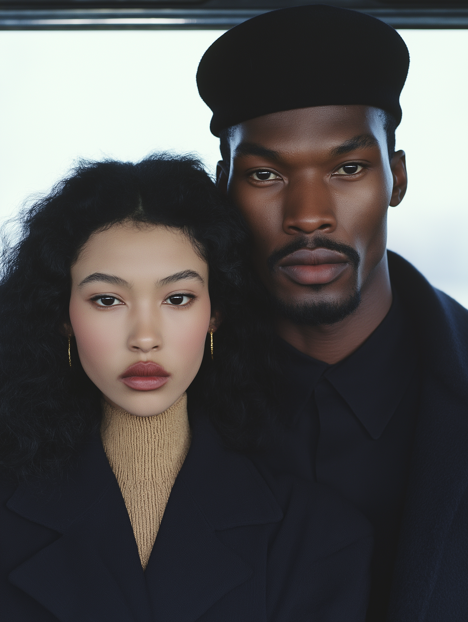Elegant portrait of a woman and man in black coats, showcasing striking features and a minimalist background.