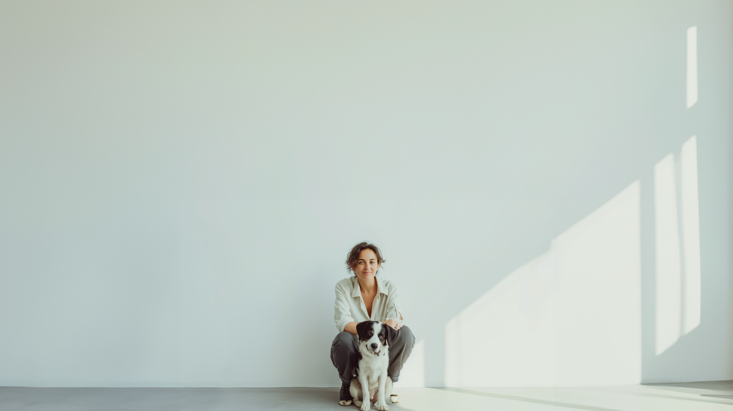Woman crouching with her black and white dog in a minimalist, sunlit room with white walls.