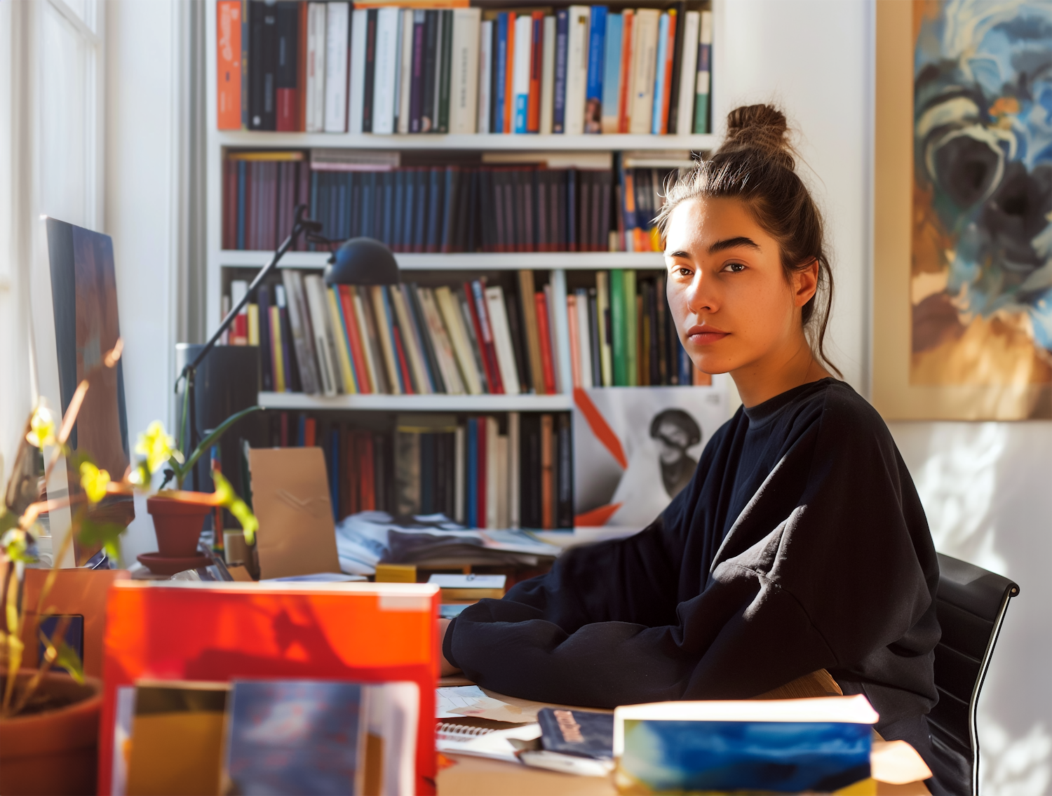Young woman in a cozy, sunlit study with bookshelves, a desk, and vibrant decor, exuding a calm and focused atmosphere.