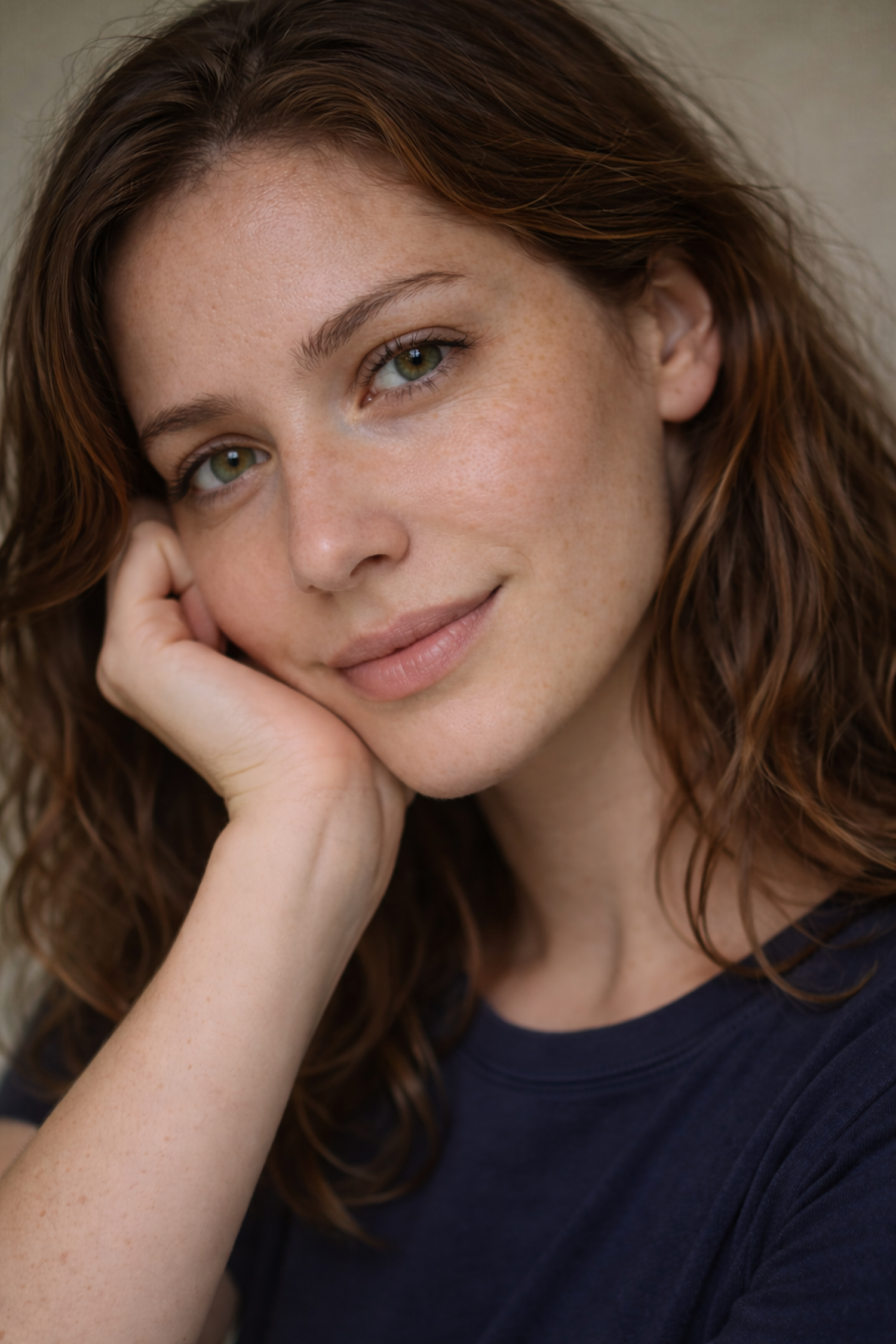 Close-up portrait of a person with green eyes and wavy brown hair, resting their face on their hand, wearing a navy blue shirt.