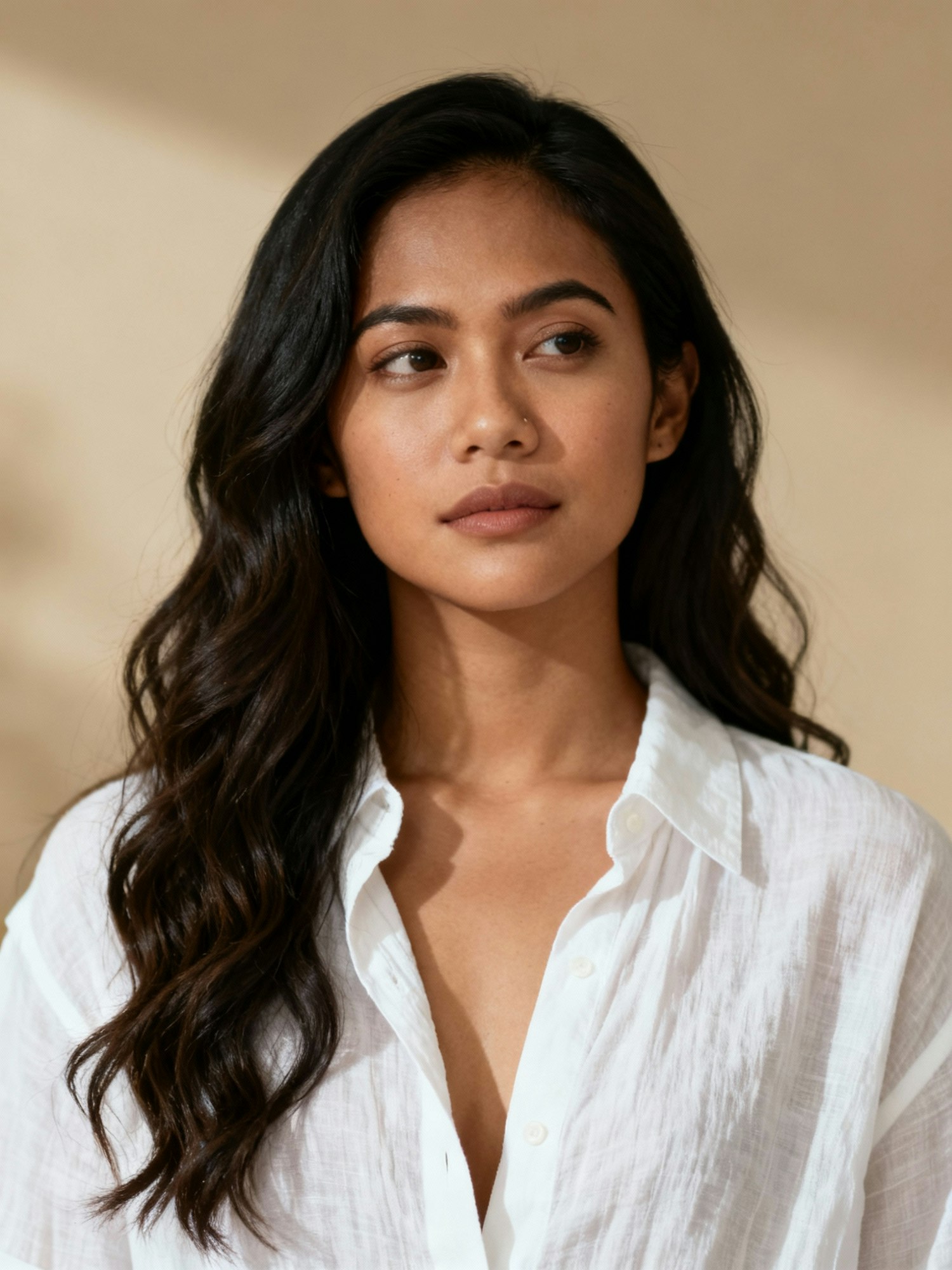 Cinematic portrait of a filipino woman, 26; long wavy hair; white linen shirt. Background: plain beige, defocused.