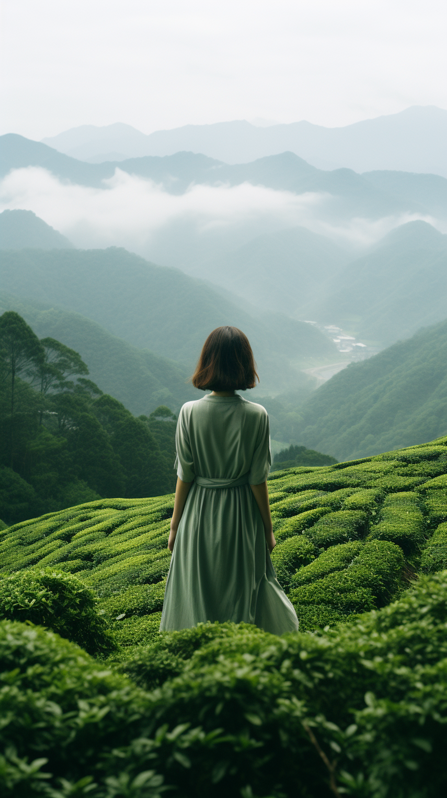 Woman in a green dress stands in lush tea fields with misty mountains in the background, creating a serene and tranquil scene.