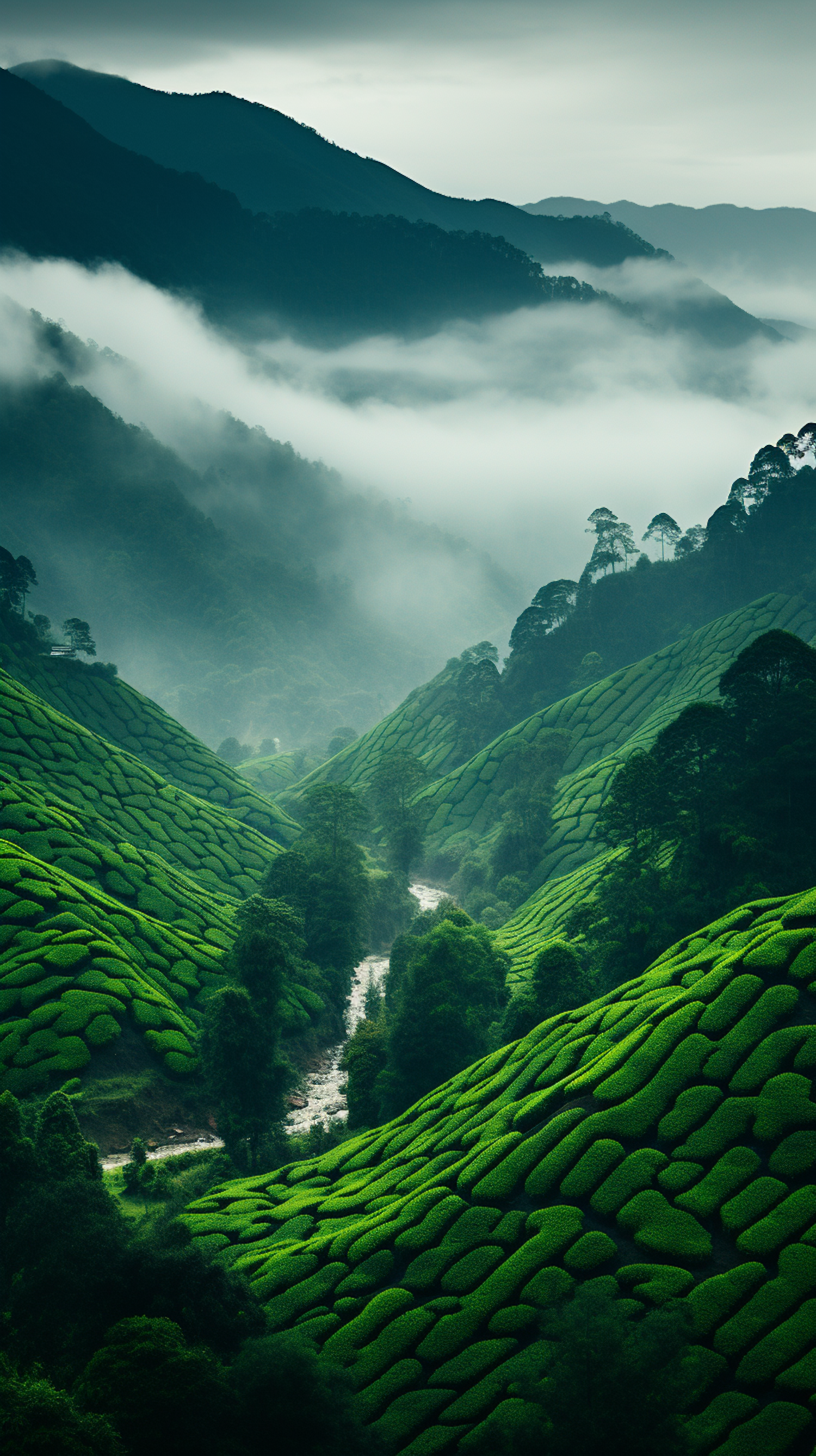 Lush green tea plantations with misty valleys and winding river create a serene and mystical landscape.