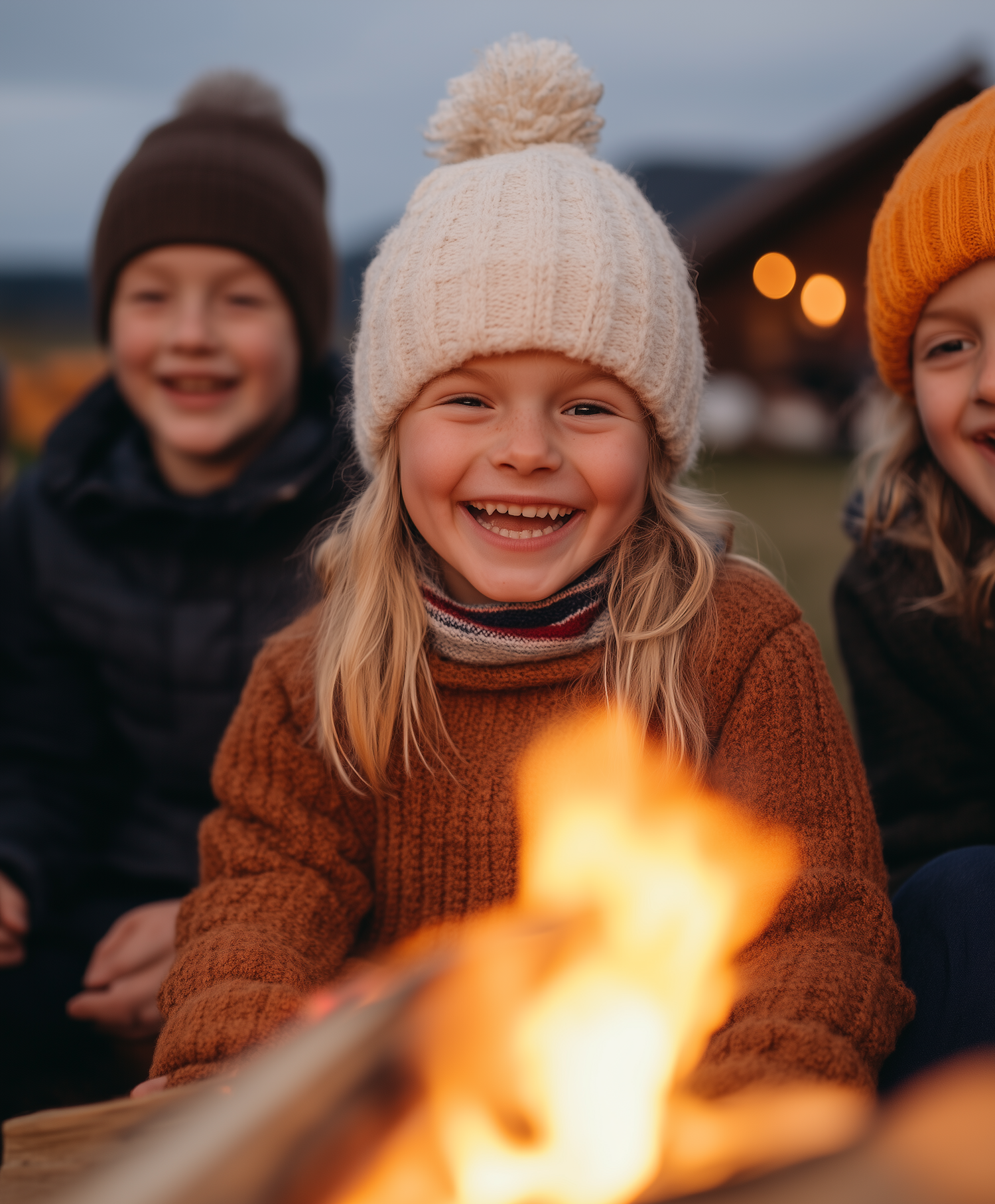 Children enjoying a cozy campfire, wearing warm hats and sweaters, with joyful smiles and a glowing fire in the foreground.