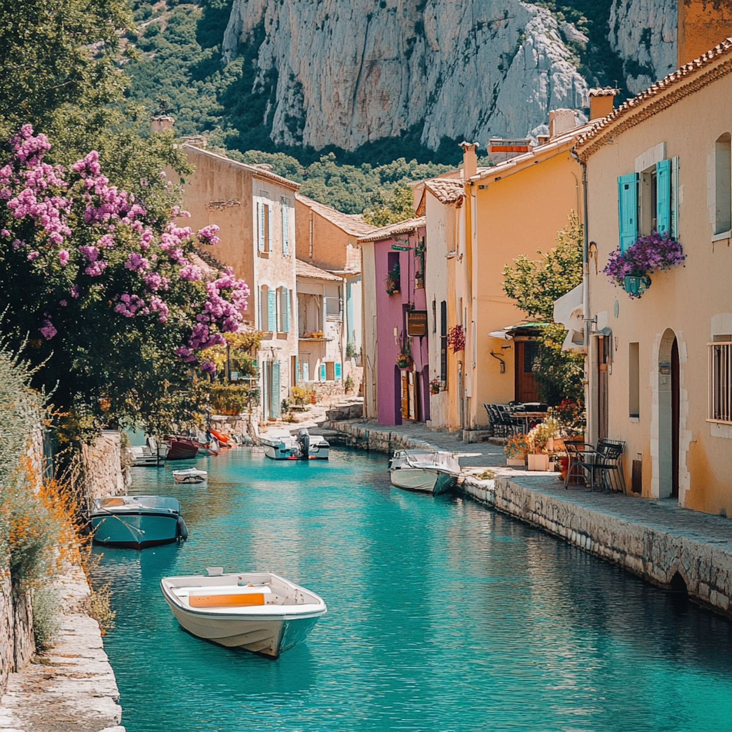 Charming canal with pastel houses, turquoise water, and blooming flowers, set against a dramatic cliff backdrop. Perfect for wanderlust vibes.