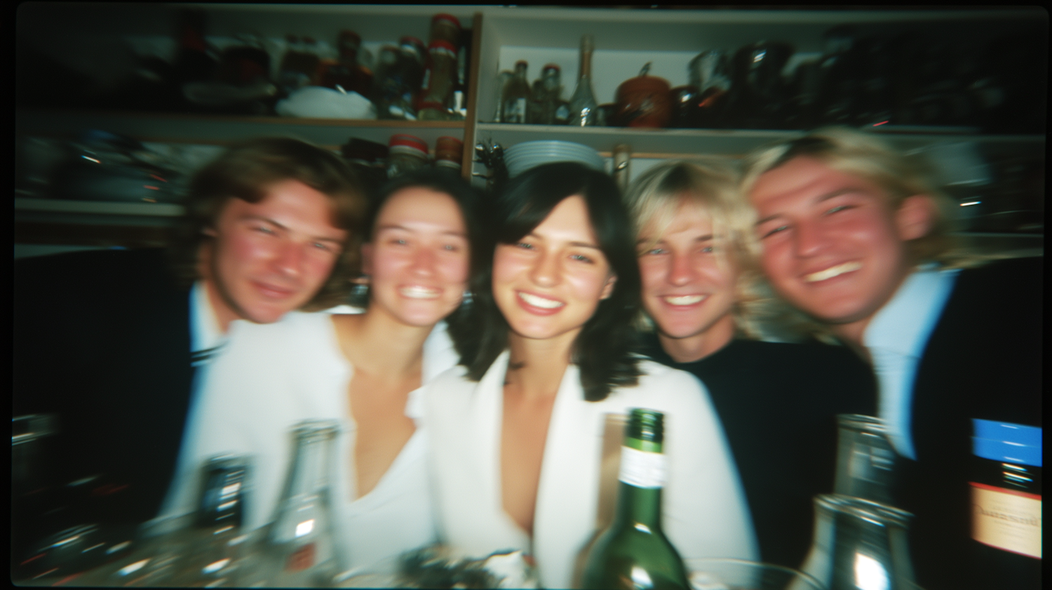 A group of friends smiling together in a cozy setting, with a soft focus adding a nostalgic touch to the candid moment.