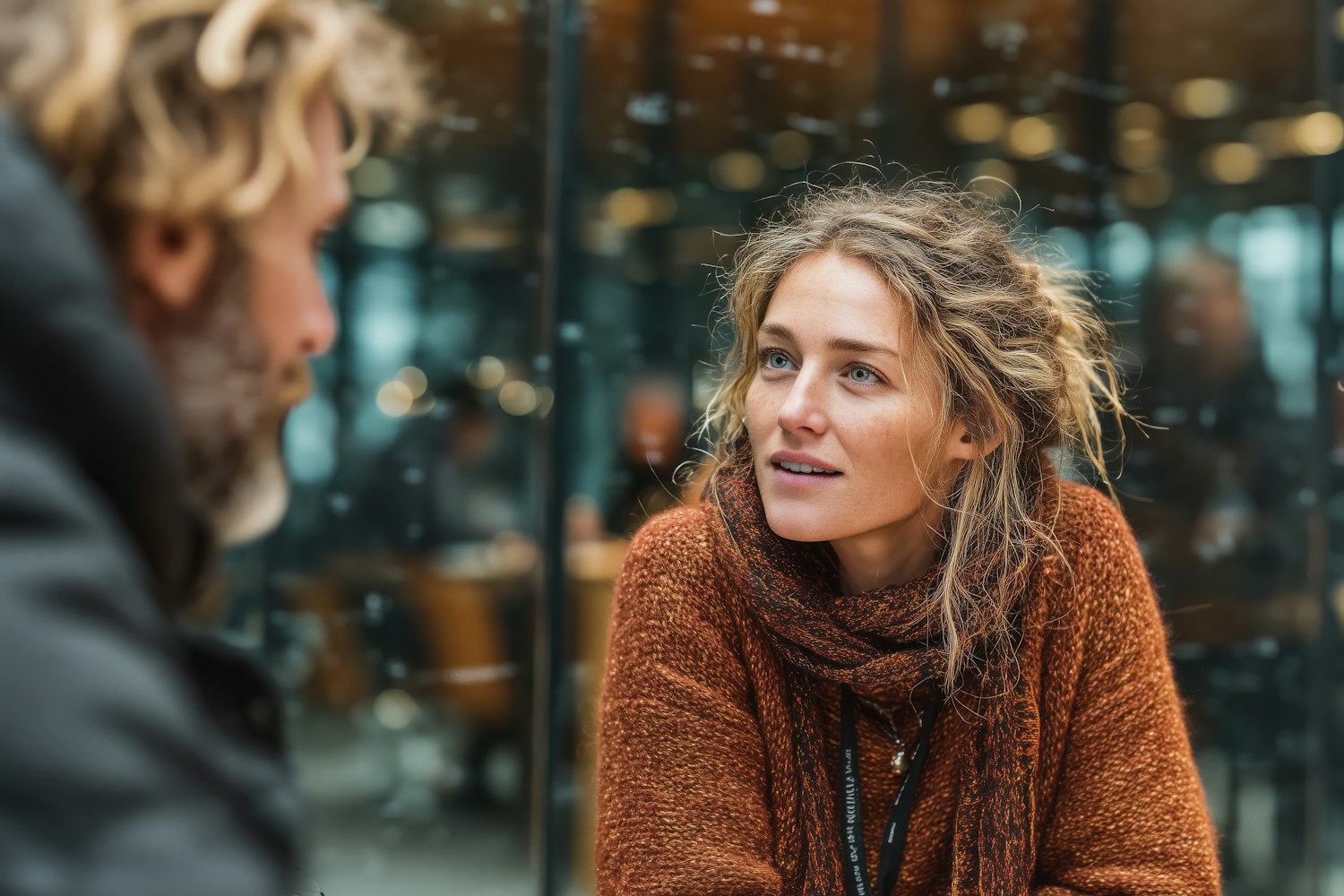 A woman in a rust-colored sweater attentively listens during a conversation in a cozy, modern indoor setting with warm lighting.