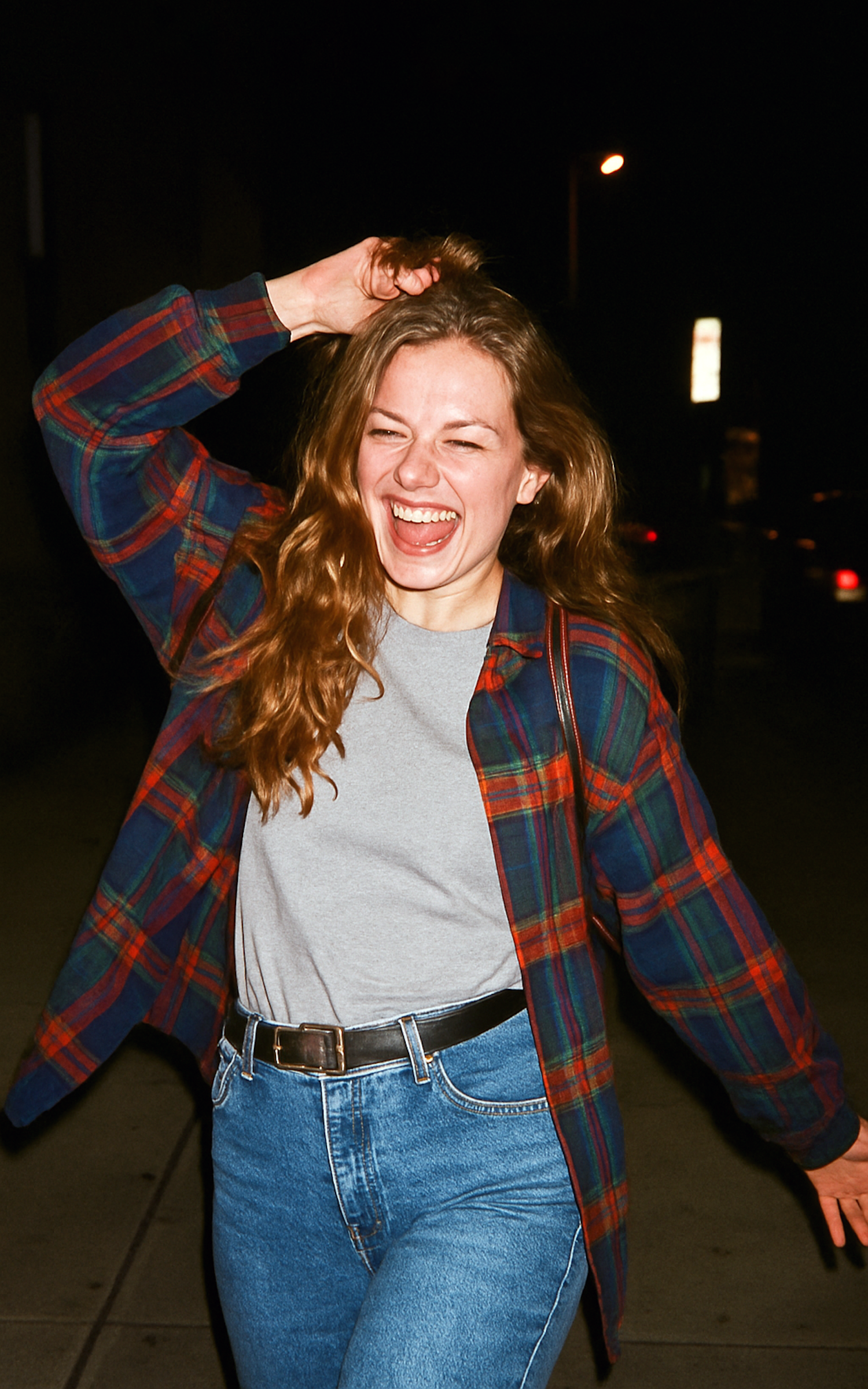 A candid shot of a young woman laughing joyfully at night, wearing a plaid flannel shirt, gray tee, and jeans, with a dark urban backdrop.