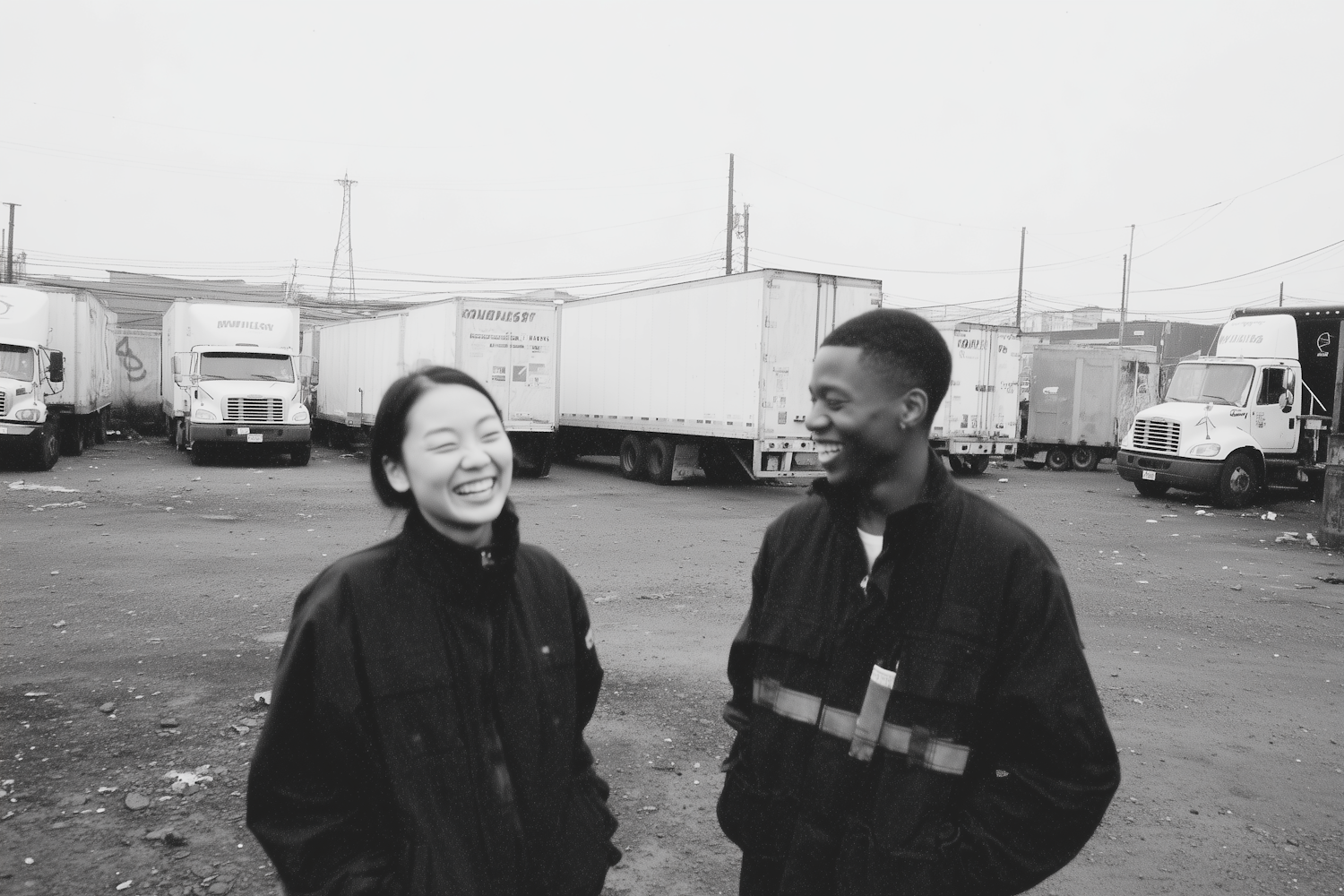Two people laughing together in a black-and-white industrial setting with parked trucks in the background.