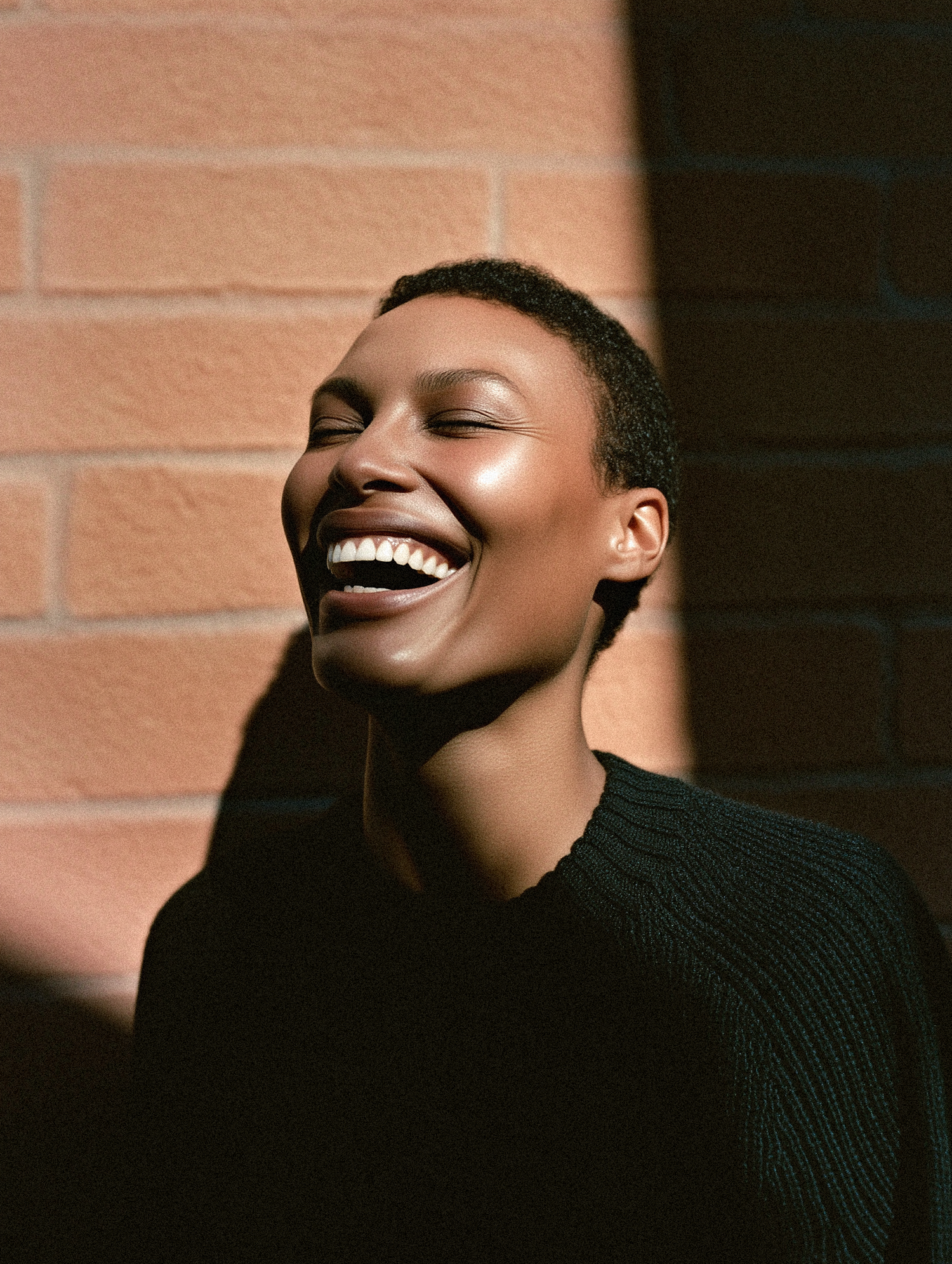 A joyful person laughing in sunlight against a brick wall, wearing a dark sweater. The lighting highlights their face beautifully.