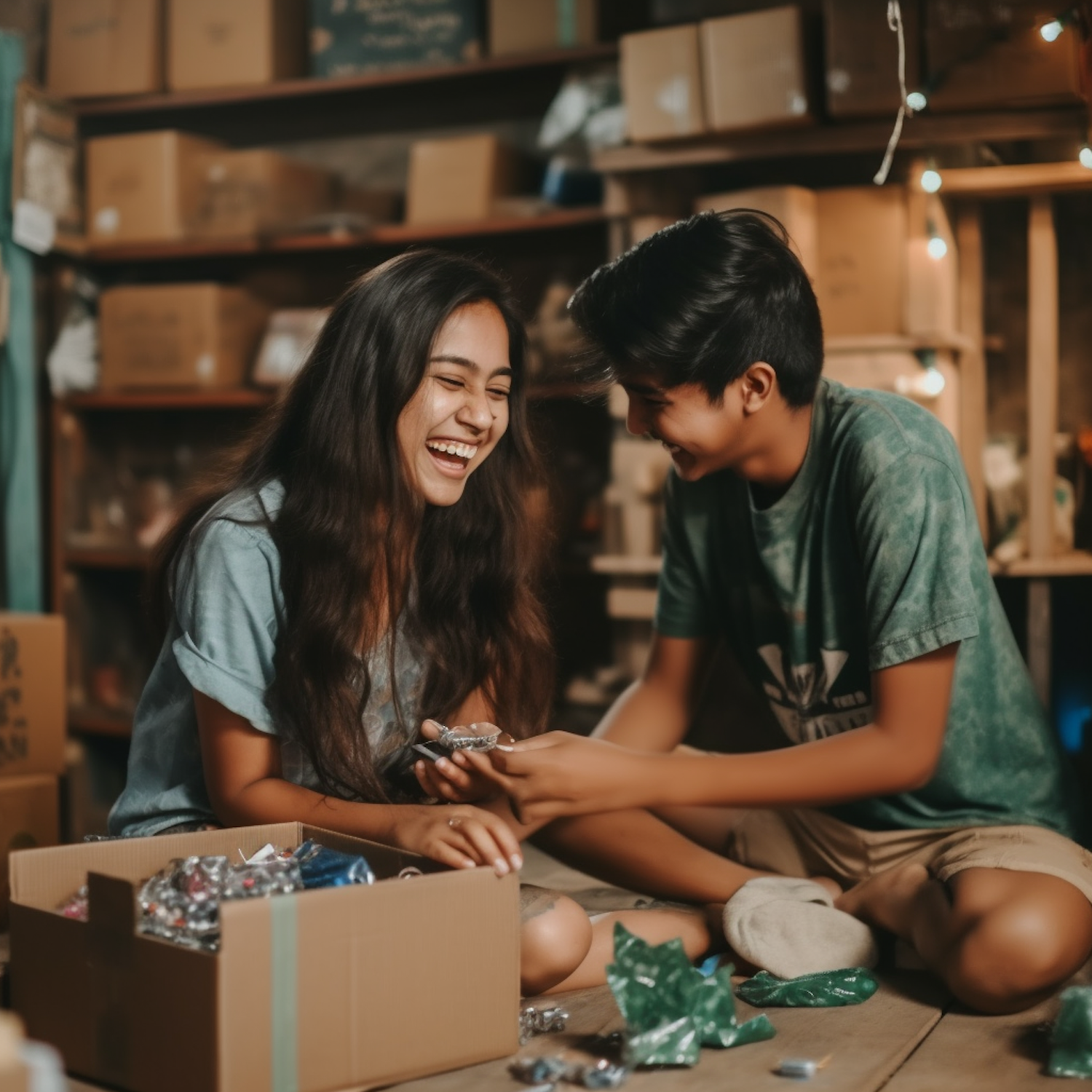 Two young friends share a joyful moment surrounded by boxes and trinkets in a cozy, warmly lit room.