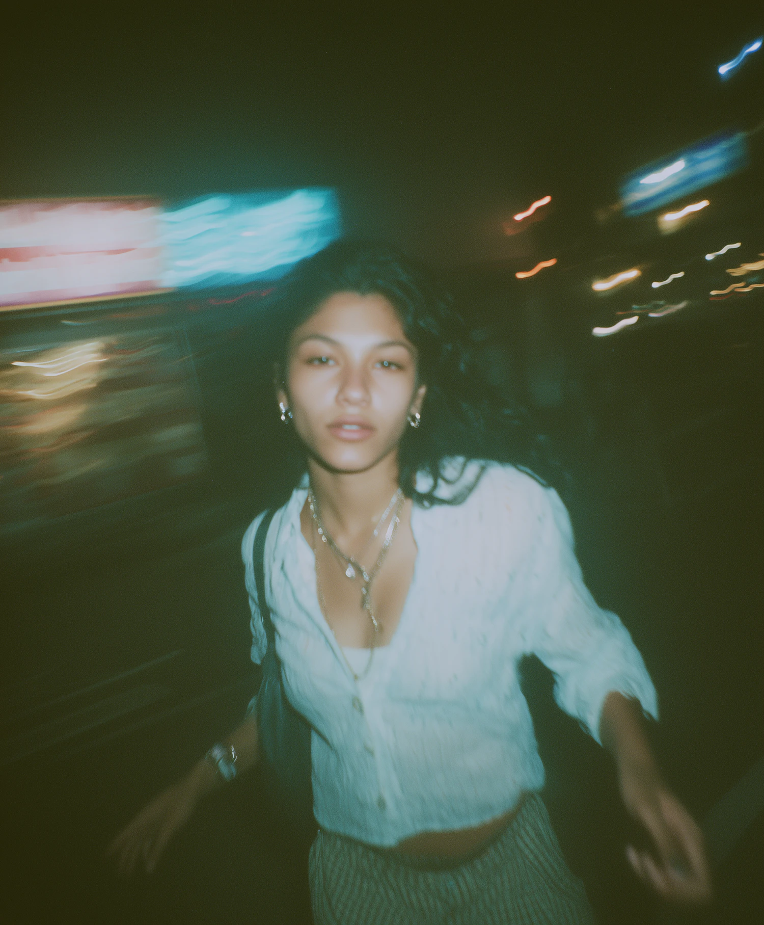 Candid shot of a young woman in motion at night, wearing layered necklaces and a light shirt, with blurred city lights in the background.