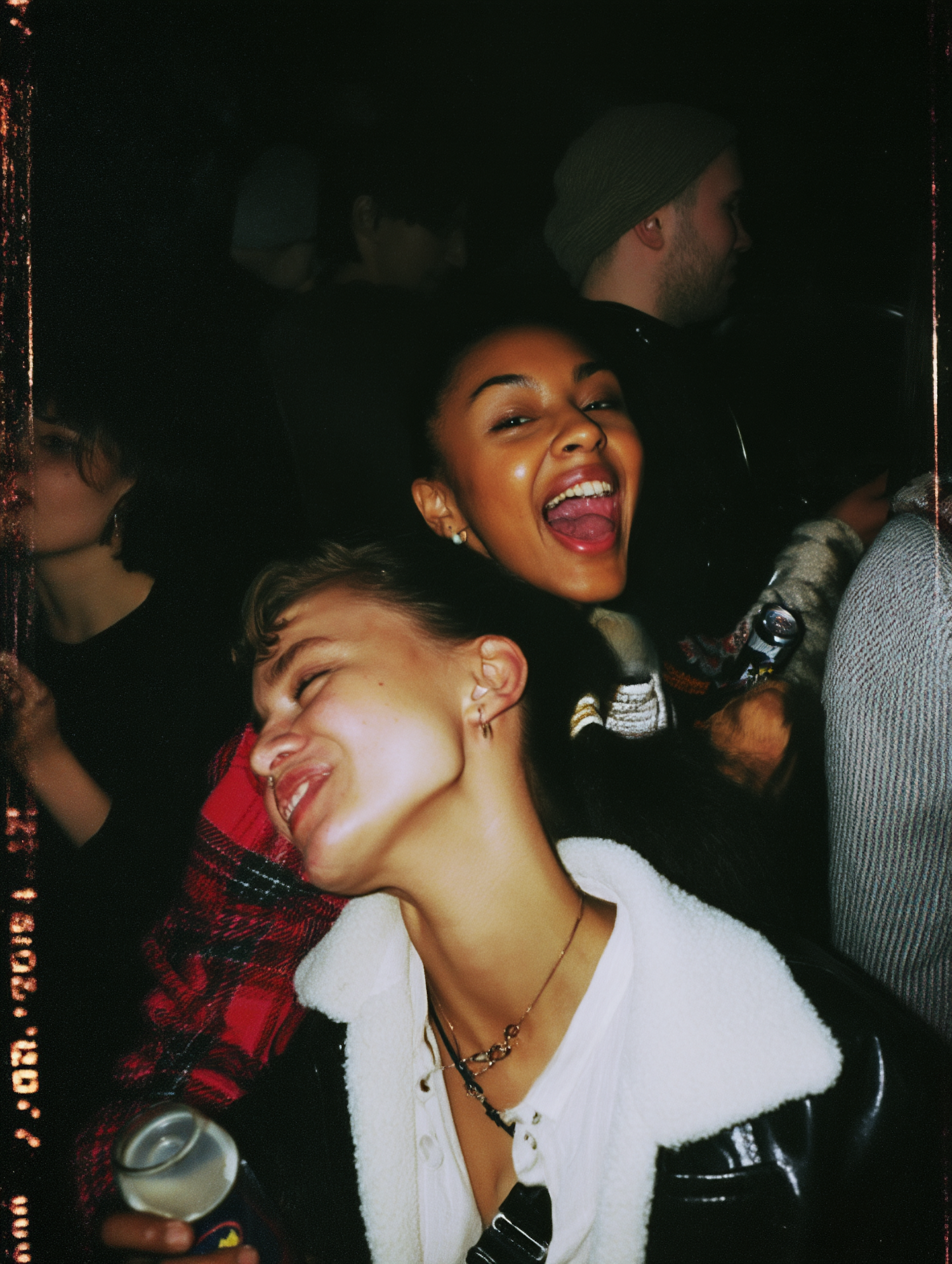 Two women laughing and enjoying a party, one holding a drink can, surrounded by a lively crowd in a dimly lit setting.