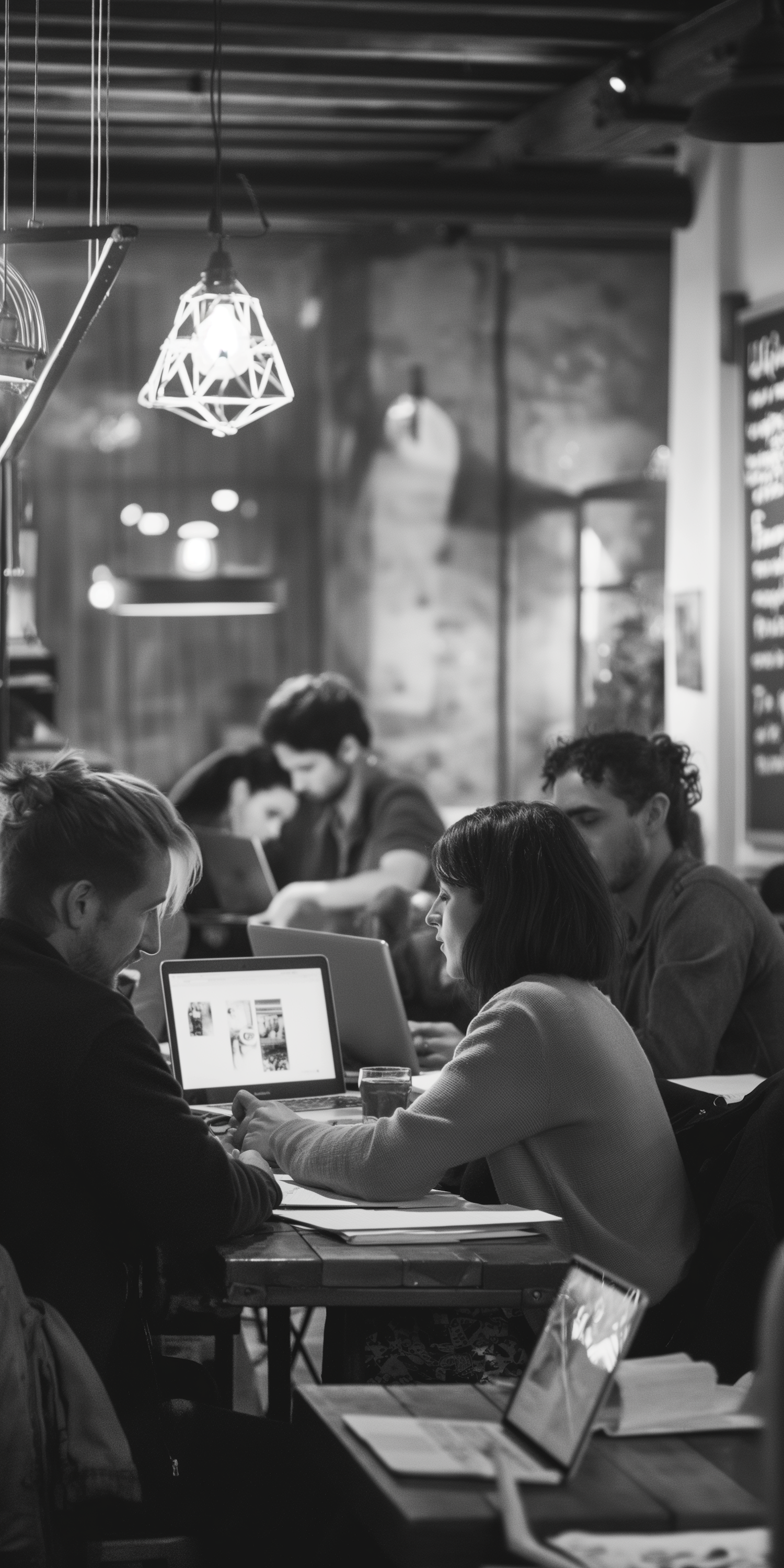 Cozy café scene with people working on laptops, warm lighting, and a relaxed atmosphere.