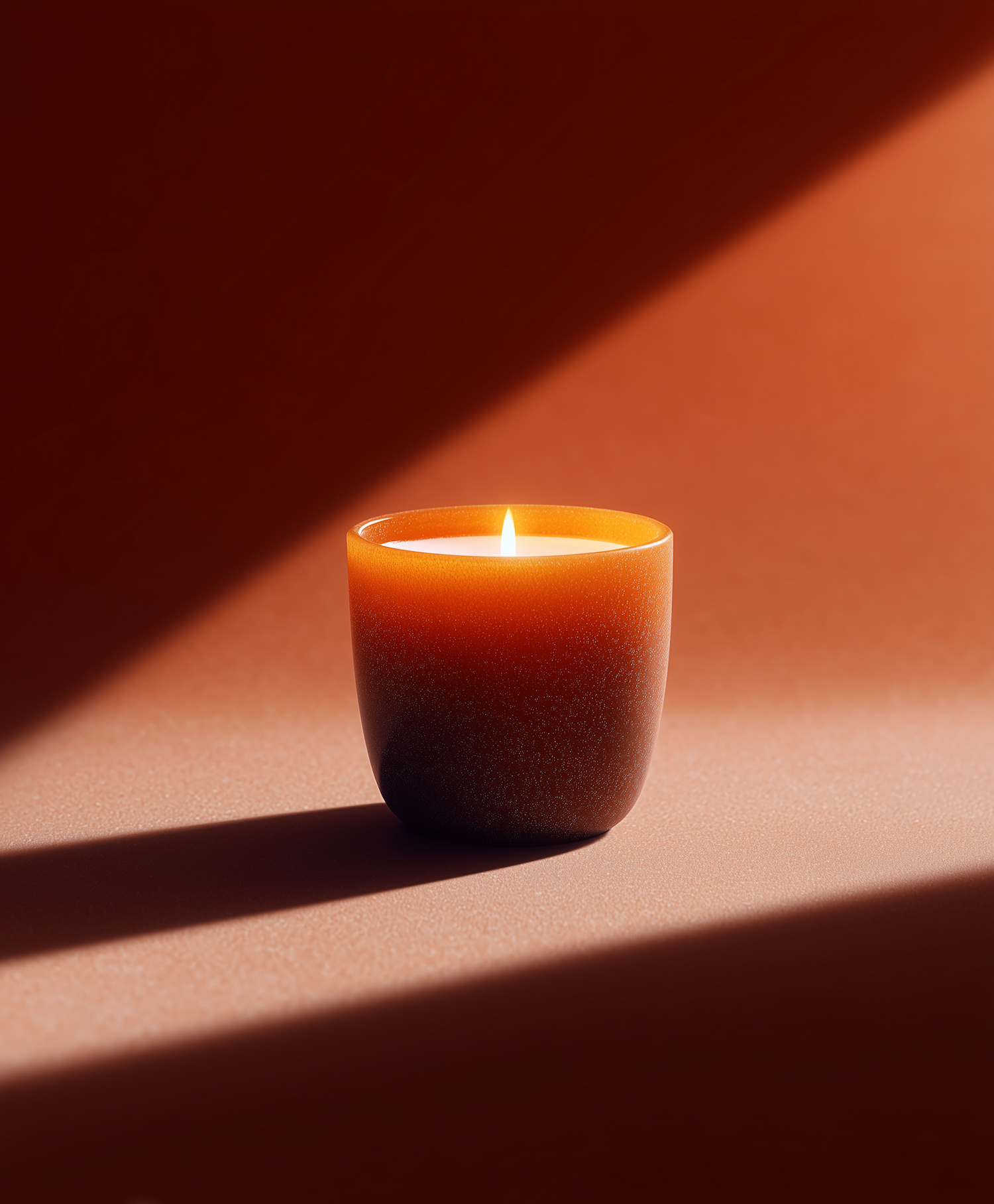 A warm, glowing candle in an orange holder on a textured surface, with dramatic lighting and shadows creating a cozy ambiance.