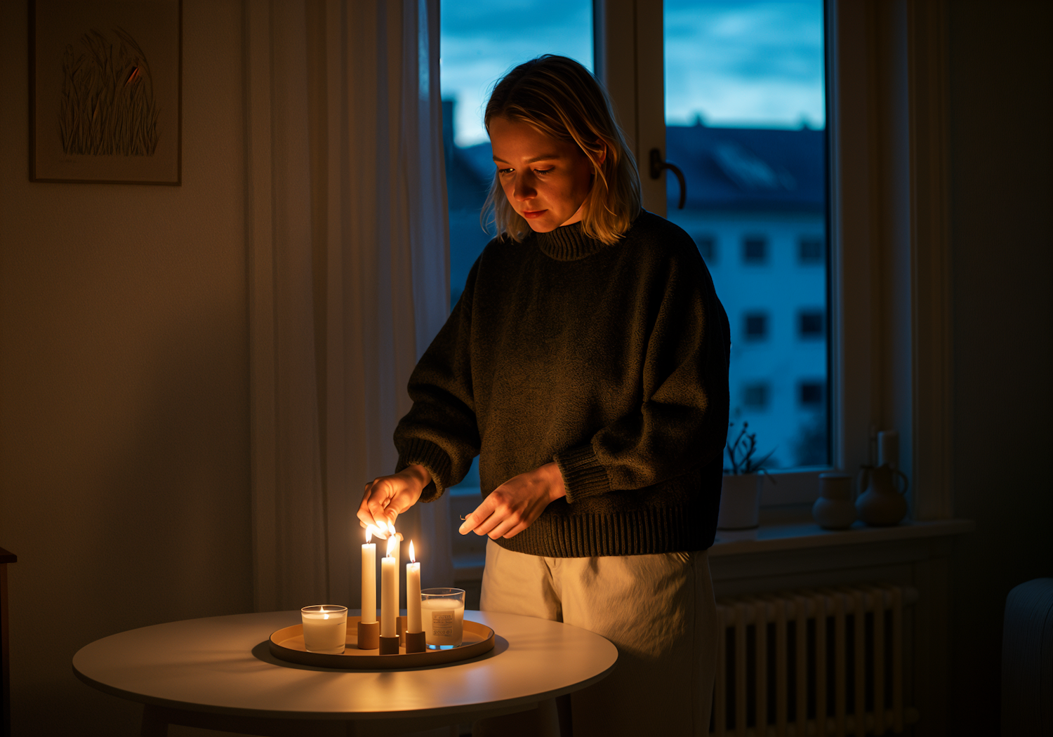 A woman lights candles on a table in a cozy, dimly lit room with a view of the evening sky through a window.