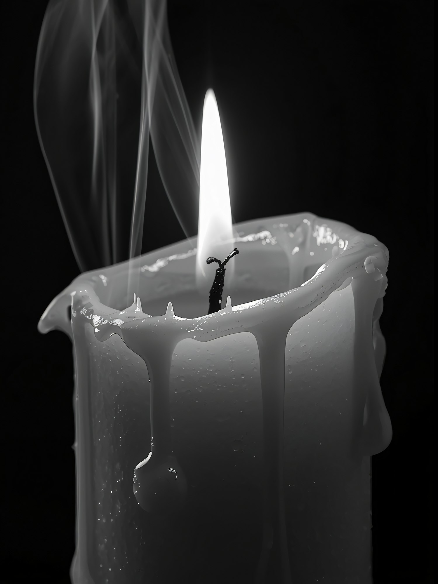 A close-up of a lit candle with dripping wax and rising smoke, set against a dark background for a dramatic and serene effect.