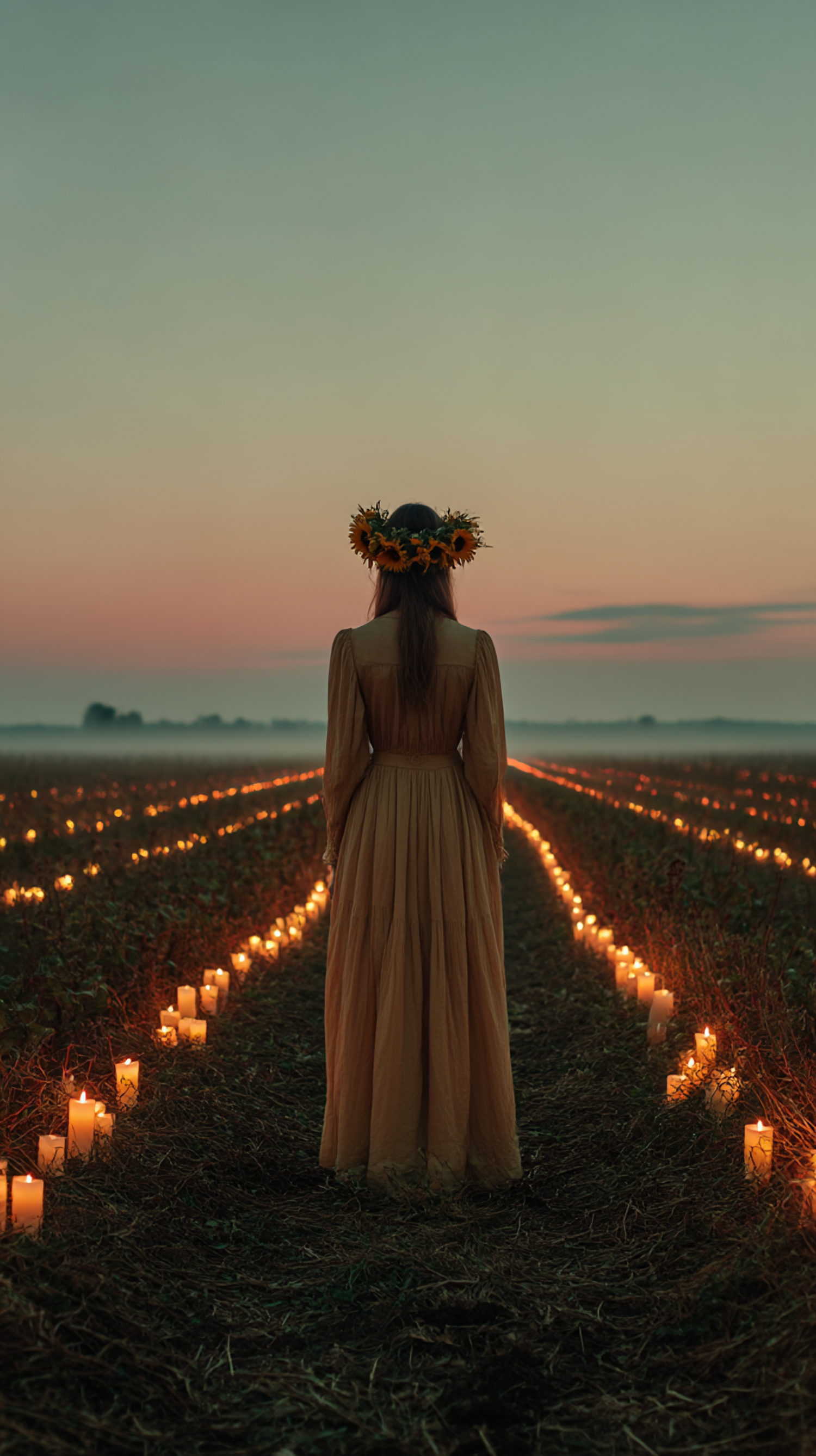 A woman in a sunflower crown stands in a candlelit field at dusk, creating a serene and enchanting atmosphere.