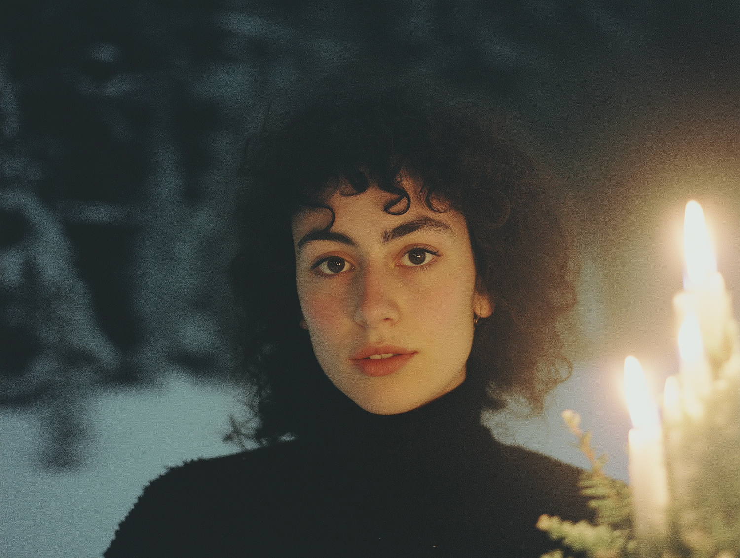 Portrait of a young woman with curly hair, lit by candlelight, against a dark, snowy background. Warm and serene ambiance.