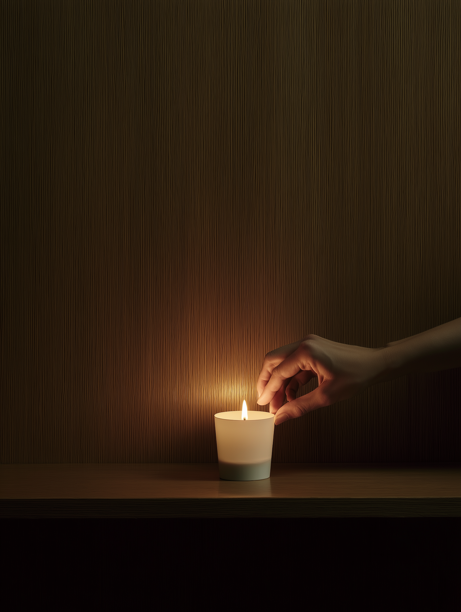 A hand adjusts the flame of a lit candle on a wooden surface, set against a textured dark brown wall in a serene, dimly lit setting.