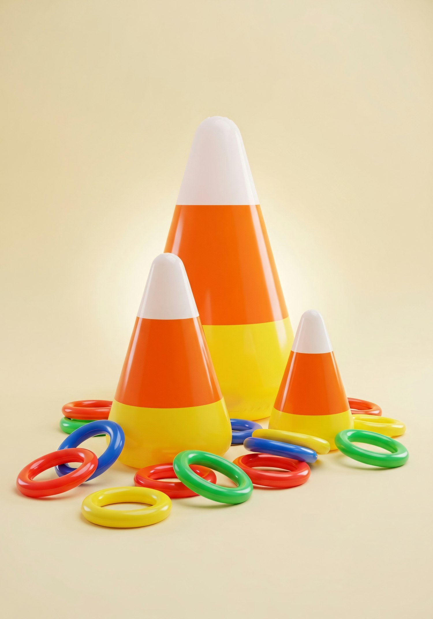 Colorful candy corn-shaped cones with scattered plastic rings on a light background, creating a playful and vibrant scene.