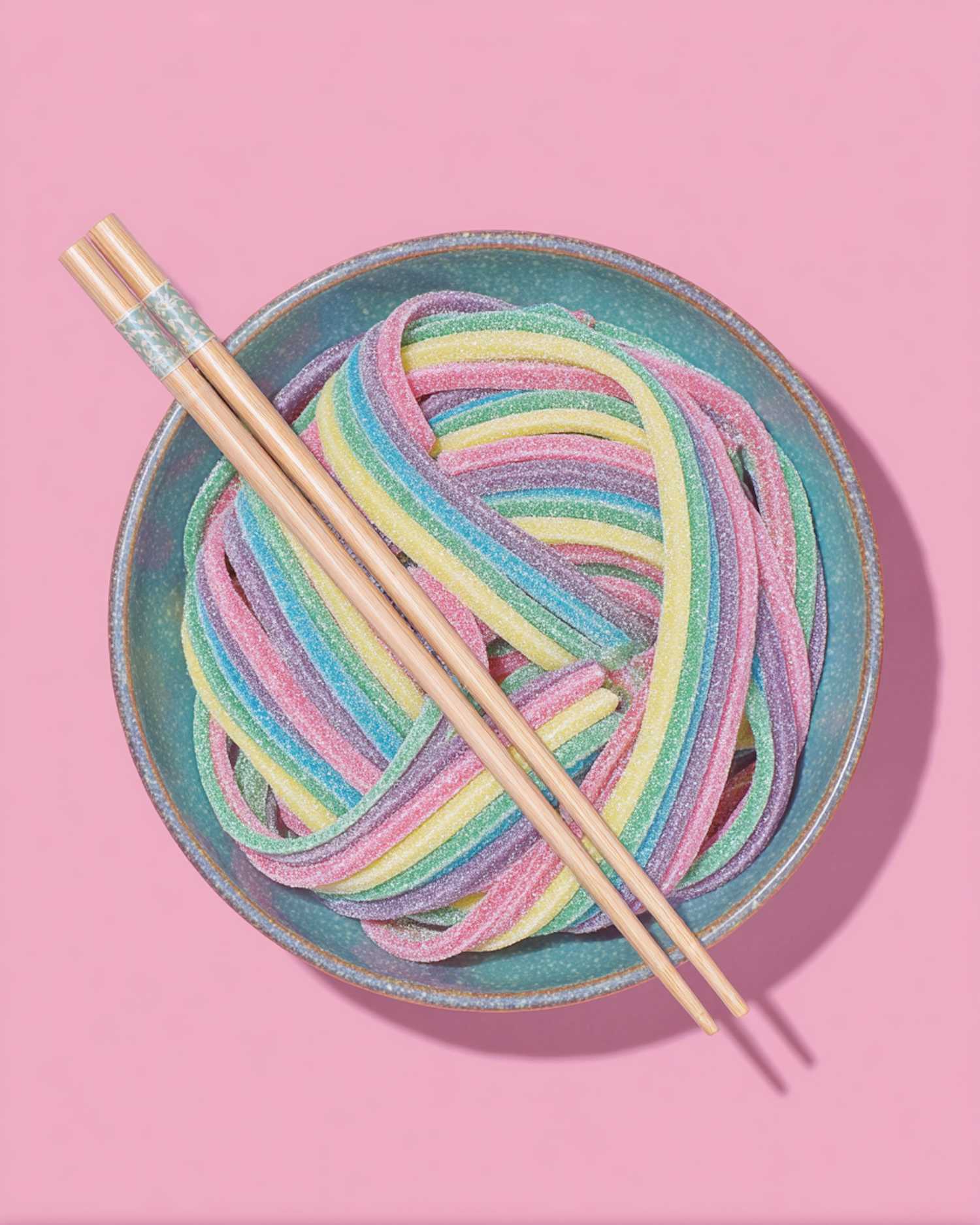A bowl of rainbow-colored candy strips styled like noodles with chopsticks, set against a pink background for a playful and vibrant look.
