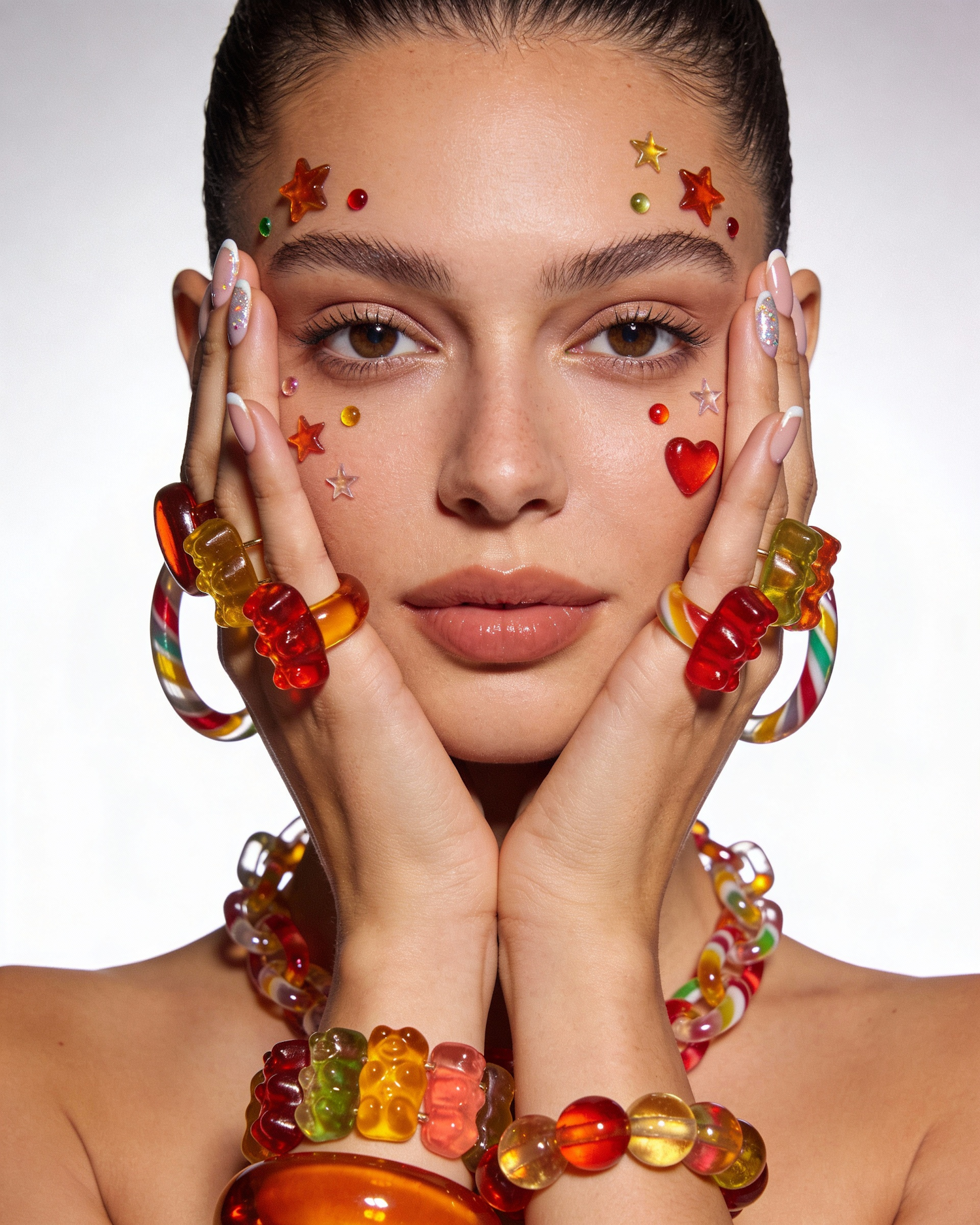 Editorial lifestyle-beauty shot featuring hands and face together in frame. Subject rests hands near cheeks, wearing multiple oversized gummy jewelry pieces: chunky gummy rings, jelly bead bracelets, gummy hoop earrings, candy chain links. The gummies are highly translucent and glossy, catching light with prismatic reflections, slightly uneven shapes like real candy. A few small gummy shapes (stars, dots, hearts) are adhered to cheeks and temples like face gems. Nails are short and clean with subtle shimmer polish. Background is clean white studio with soft gradient. Lighting is bright and even, emphasizing gummy texture, reflections, and depth. Mood is playful yet high-fashion, modern candy editorial, ultra-detailed realism.